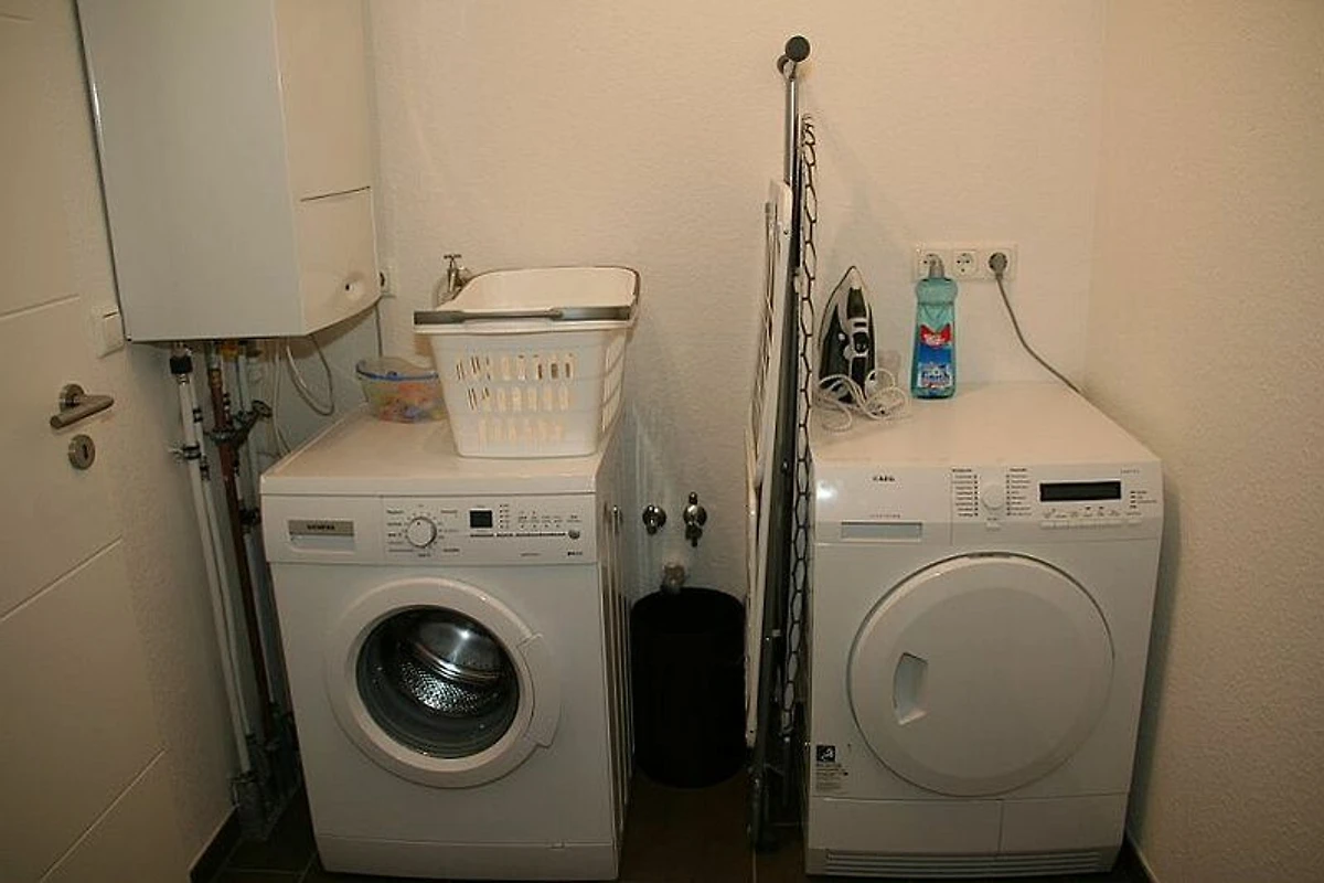 Waschmaschine, Trockner, Wäscheständer, Bügelbrett, Bügeleisen und ein Kinderhochstuhl stehen im Hauswirtschaftsraum zur Verfügung. Ein PKW-Einstellplatz gehört zum Haus.