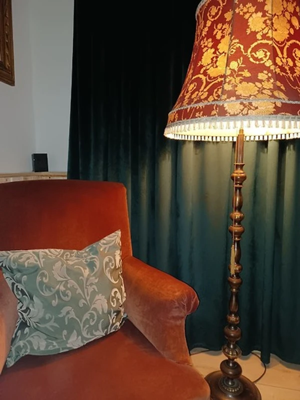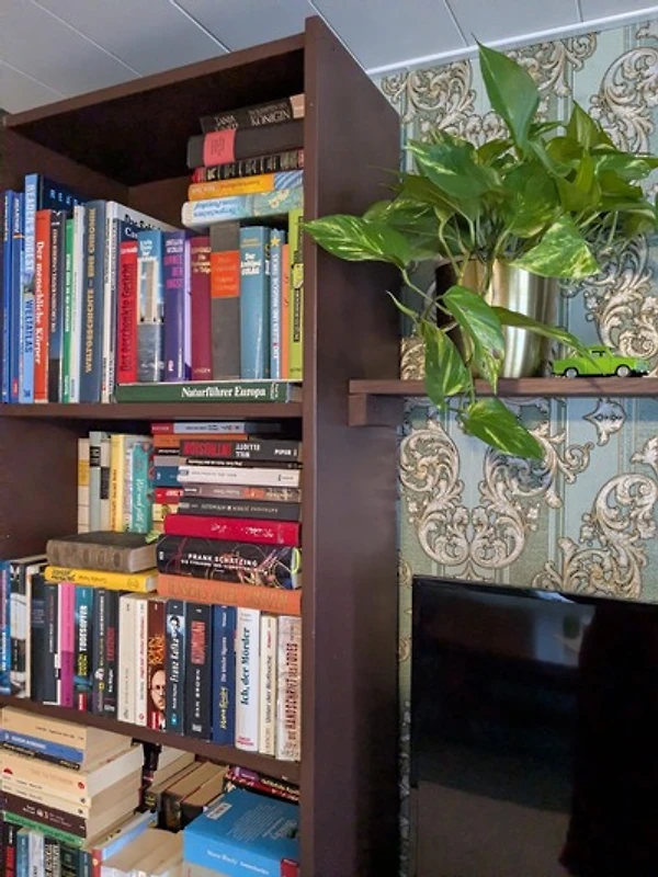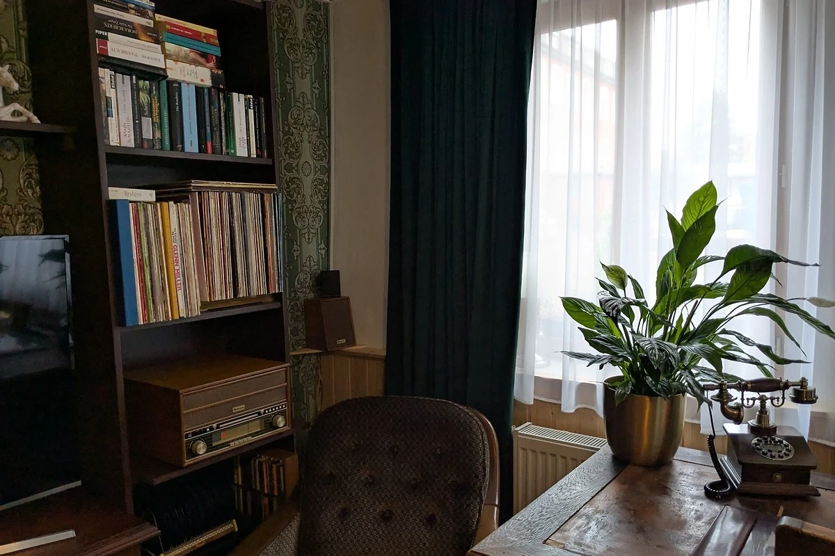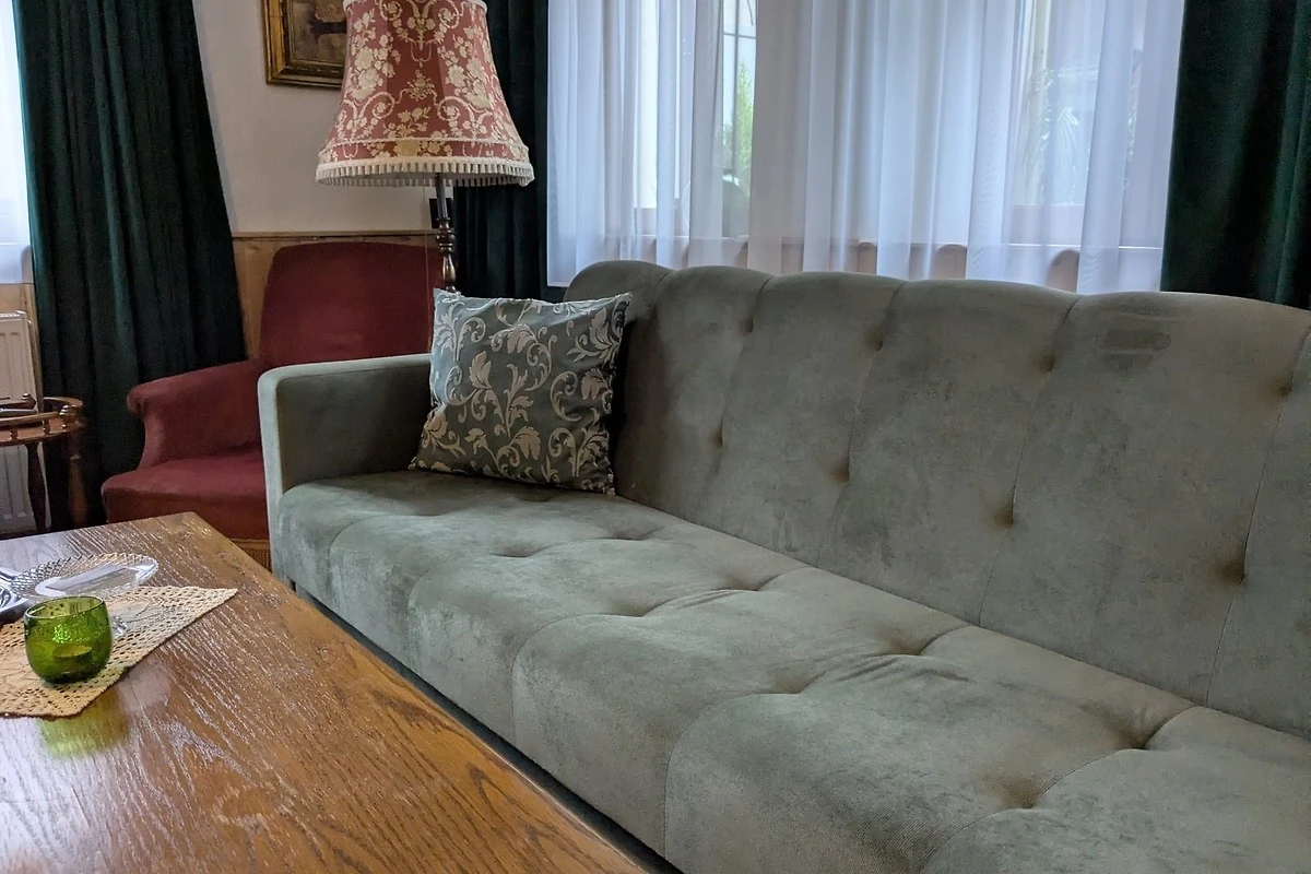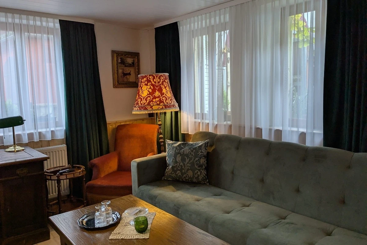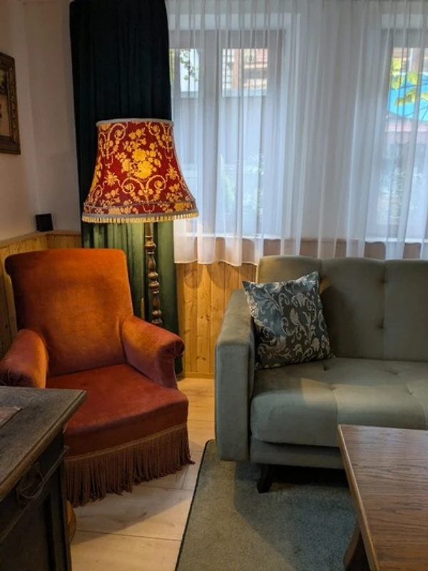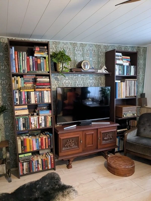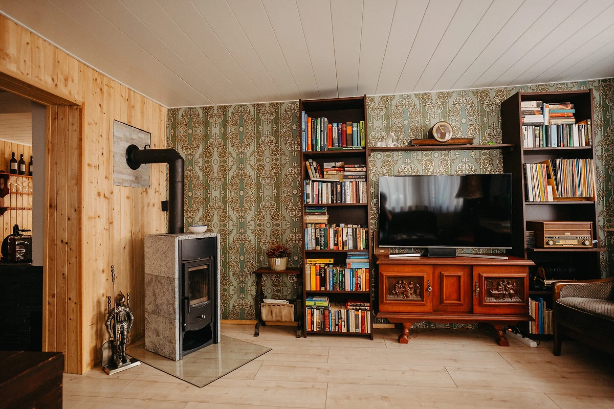 Der Wohnbereich mit gemütliche Couch und Leseecke lädt zum Verweilen ein. Zur Unterhaltung steht eine gut ausgestattete Bibliothek, Flachbildfernseher, DVD-Player sowie einen Plattenspieler mit Schallplatten, Radio mit CD und USB zu Verfügung.