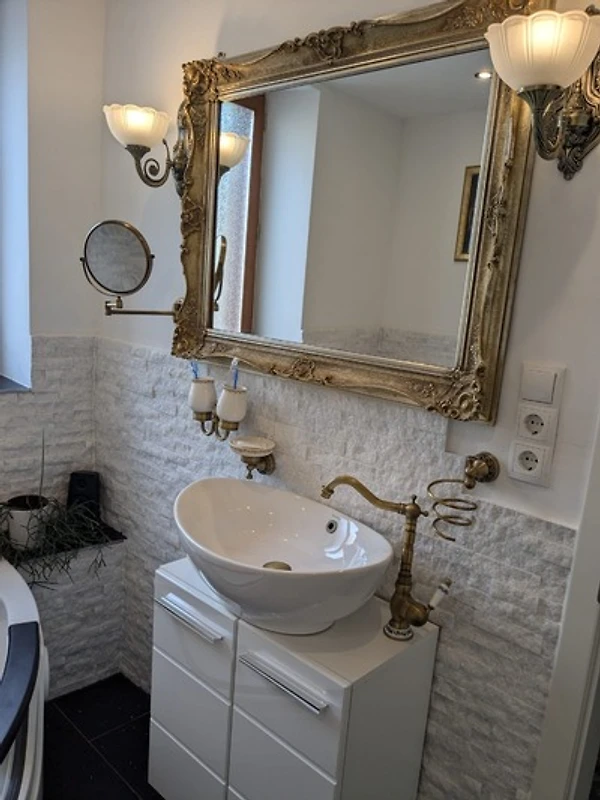 Ein weiteres Highlight in unserer Ferienwohnung ist das Badezimmer. Romantisch mit schönen Details und moderner