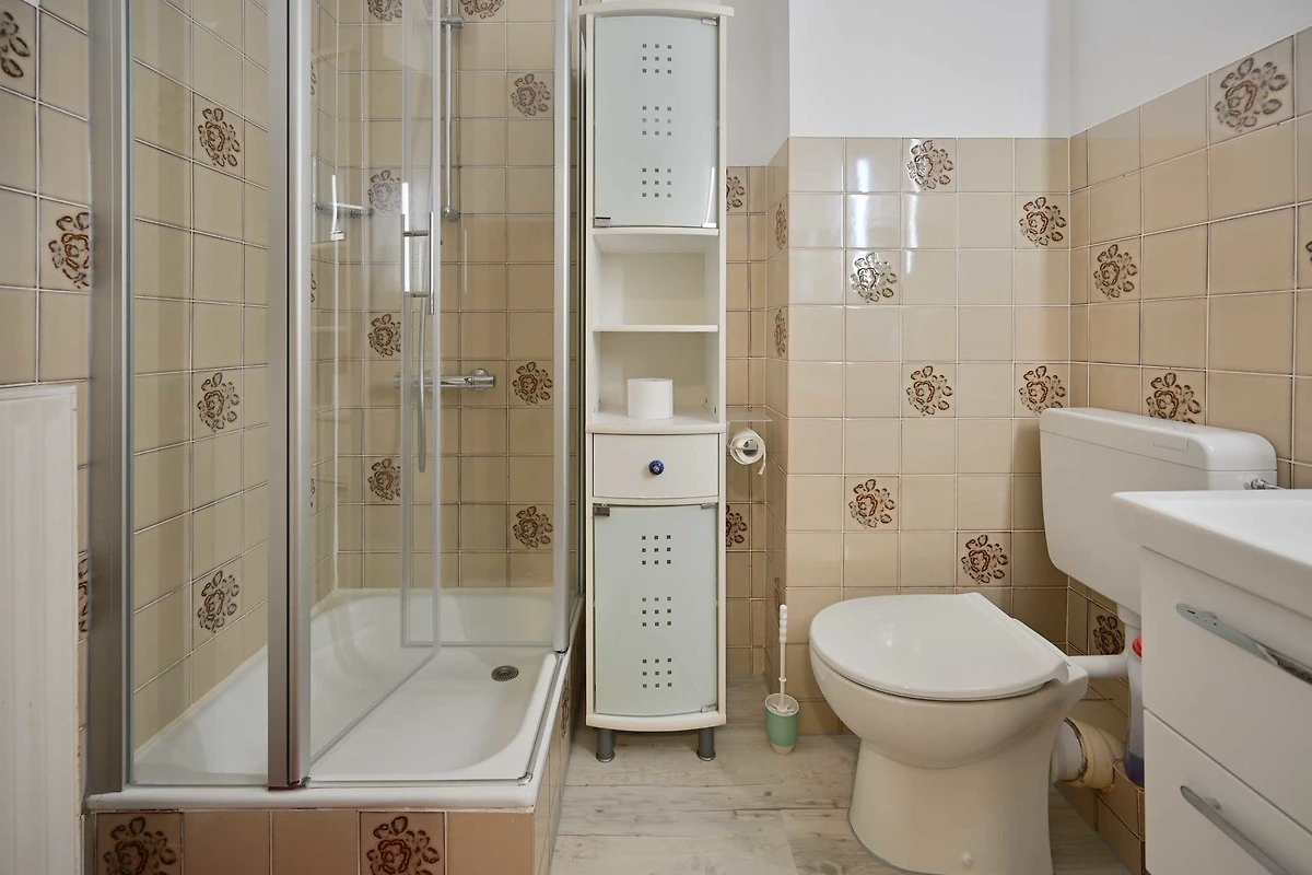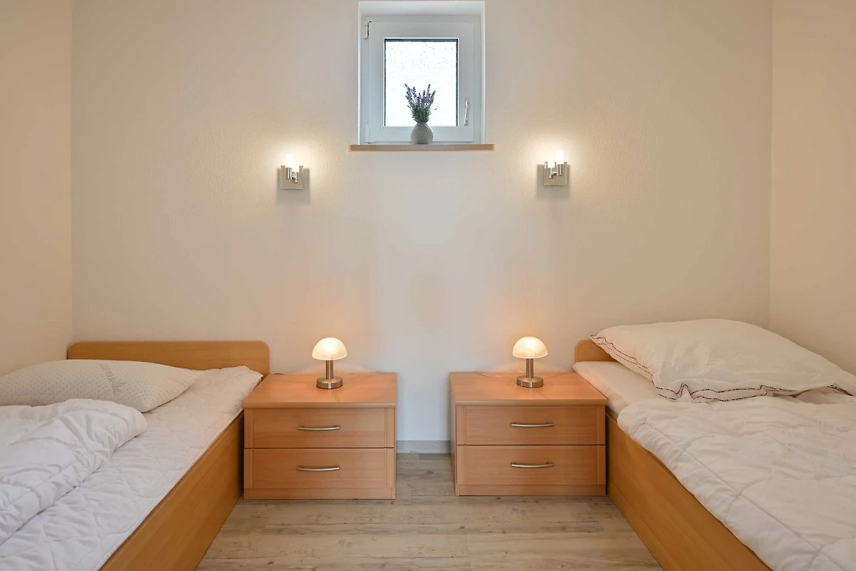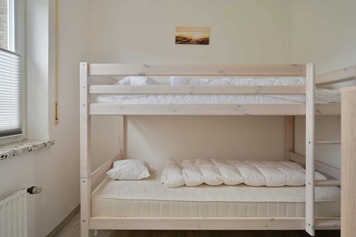 Das eine Schlafzimmer besteht aus zwei Einzelbetten mit zwei Nachttischen, dass zweite Schlafzimmer verfügt über ein Hochbett mit zwei Schlafplätzen und Kleiderschrank. Sollte ein Kleinkind mitreisen, steht ein Kinderreisebett und ein Hochstuhl bereit. Das Badezimmer verfügt über eine Dusche mit Glastüren und einem WC.