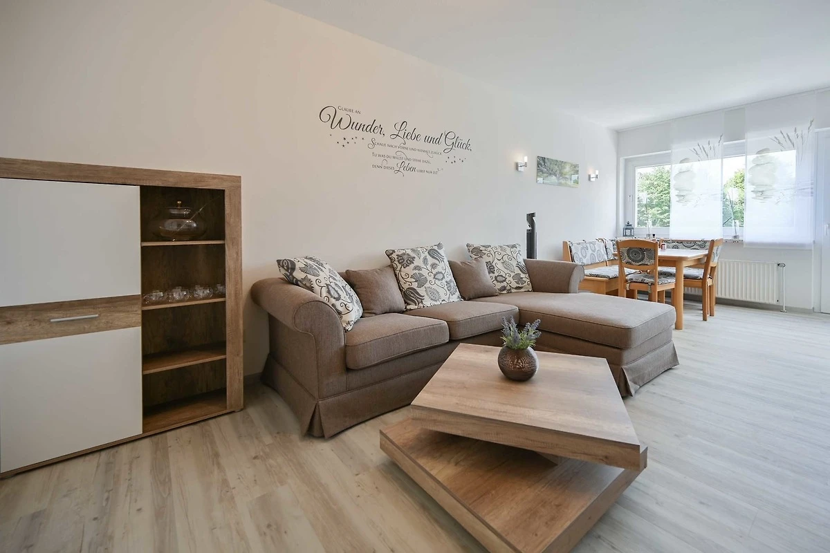 Die neue Küche verfügt über einen Backofen, ein Ceranfeld sowie eine Spülmaschine und einen Kaffeevollautomaten. Ebenfalls befindet sich im Wohnbereich eine Eckbank mit Stühlen, sowie ein Couchbereich mit Tisch und Flachbild-TV und Wohnwand. Von hieraus besteht die Möglichkeit auf den Balkonbereich mit Gartenmöbeln zu gelangen.