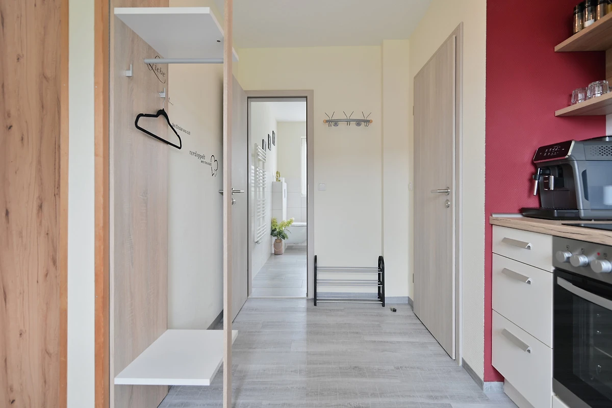 Die "Ferienwohnung meine mittlere Auszeit" liegt im Obergeschoss auf der rechten Seite. Der Garderobenbereich verfügt über ein Schuhregal und grenzt direkt an die offene Küche an, welche zur Saison 2017 neueingebaut worden ist. Die Küche verfügt über einen Backofen, ein Ceranfeld sowie eine Spülmaschine und einen Kaffeevollautomaten. Ebenfalls befindet sich ein Essplatz für zwei Personen im Küchenbereich.