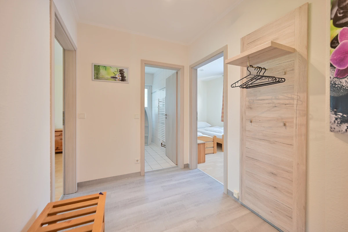Der Eingangsbereich verfügt über einen Garderobenbereich mit Schlüsselkasten und verbindet die Wohnräume mittels eines Flurs.
