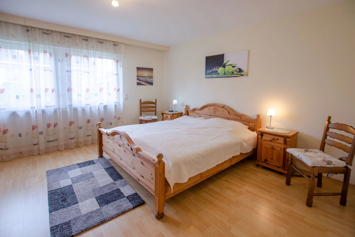 Das grosse Schlafzimmer besteht aus einem Doppelbett mit zwei Nachttischen und dimmbaren Nachtischlampen, sowie einem grossen Kleiderschrank. Sollte ein Kleinkind mitreisen, steht im grossen Schlafzimmer ein Kinderreisebett und ein Hochstuhl bereit.