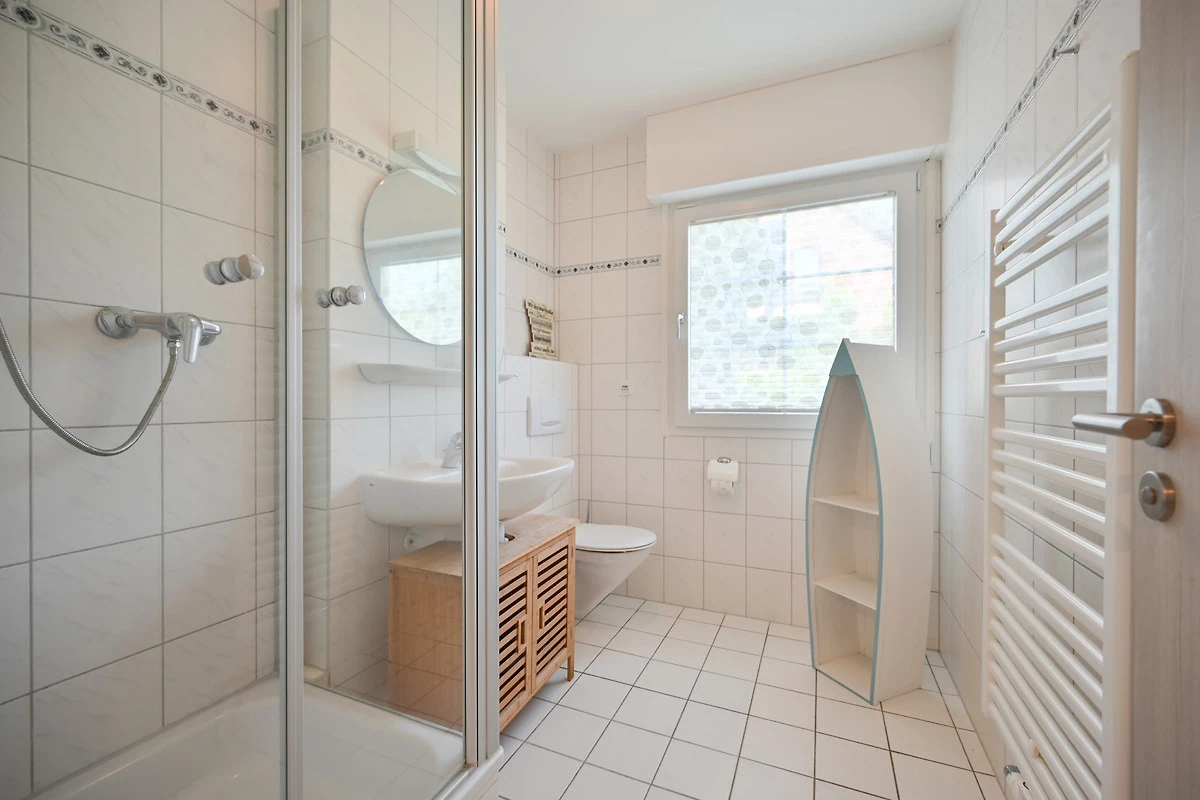 Das Badezimmer verfügt über ein Aussenfenster zum Lüften und besteht aus einer Dusche mit Glastüren und einem WC.
