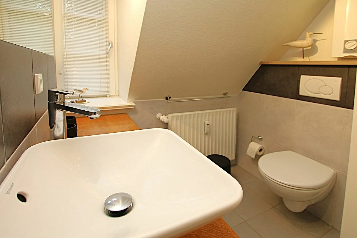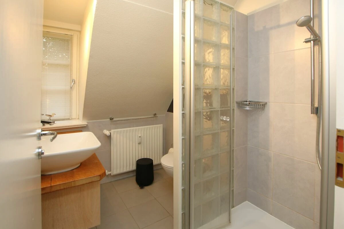 BAD: Dusche/WC. Vom Flur führt eine offene Treppe ins Dachgeschoss, dort stehen 2 Einzelbetten und ein Einbauschrank zur Verfügung.