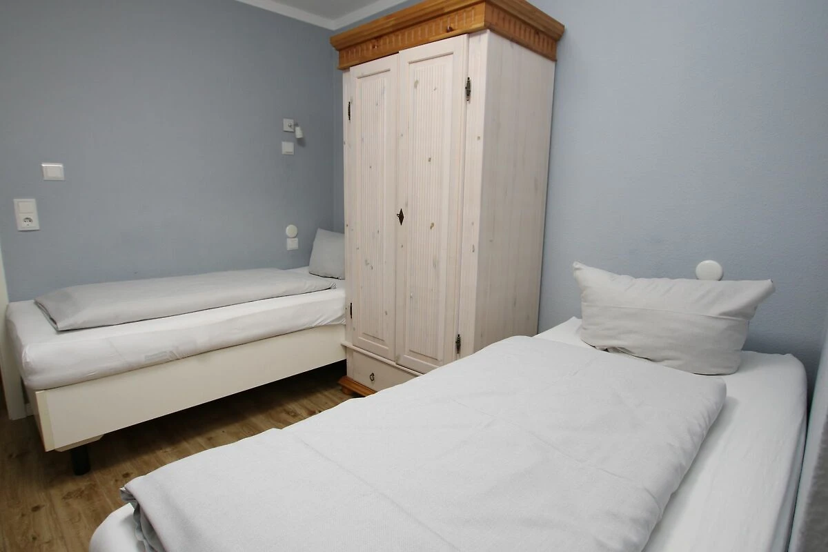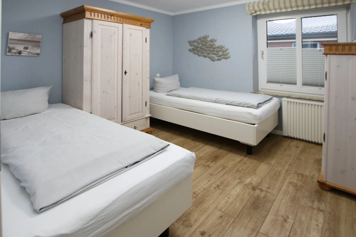 Ferienwohnung in Wyk auf Föhr, Lerchenweg 16, Wohnung Nr.2 3-Zimmer-Nichtraucherwohnung (ca. 58 qm) im Erdgeschoss mit Südterrasse und kleinem Garten. WOHNZIMMER: Ledercouch über Eck mit Couchtisch, Eßtisch mit Eckbank und 2 Stühlen. KÜCHENZEILE mit allem Komfort. SCHLAFZIMMER: Doppelbett 2 m x 2,20 m, Kleiderschrank und Kommode. SCHLAFZIMMER 2: 2 Einzelbetten, Kleiderschrank und Kommode. BAD: Dusche und WC.