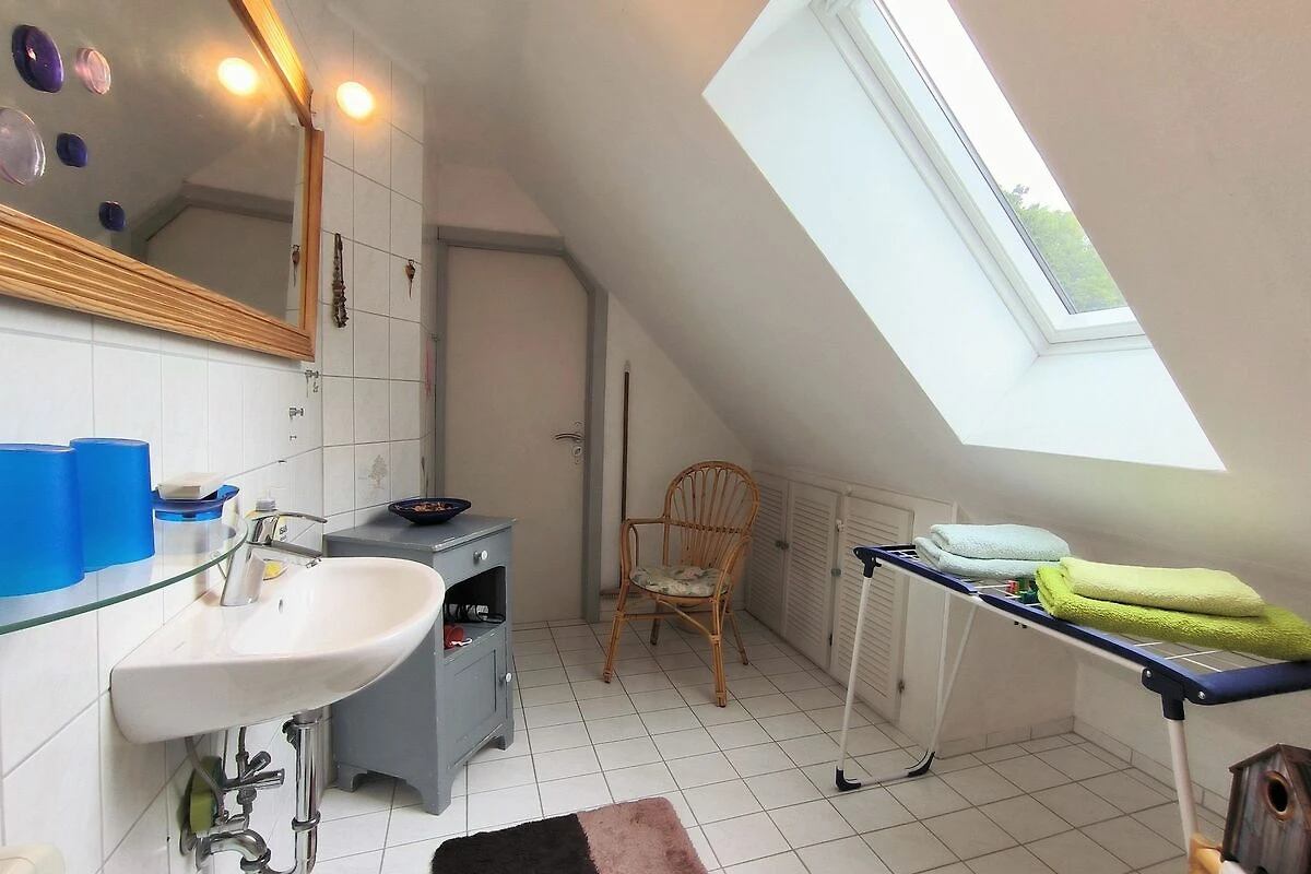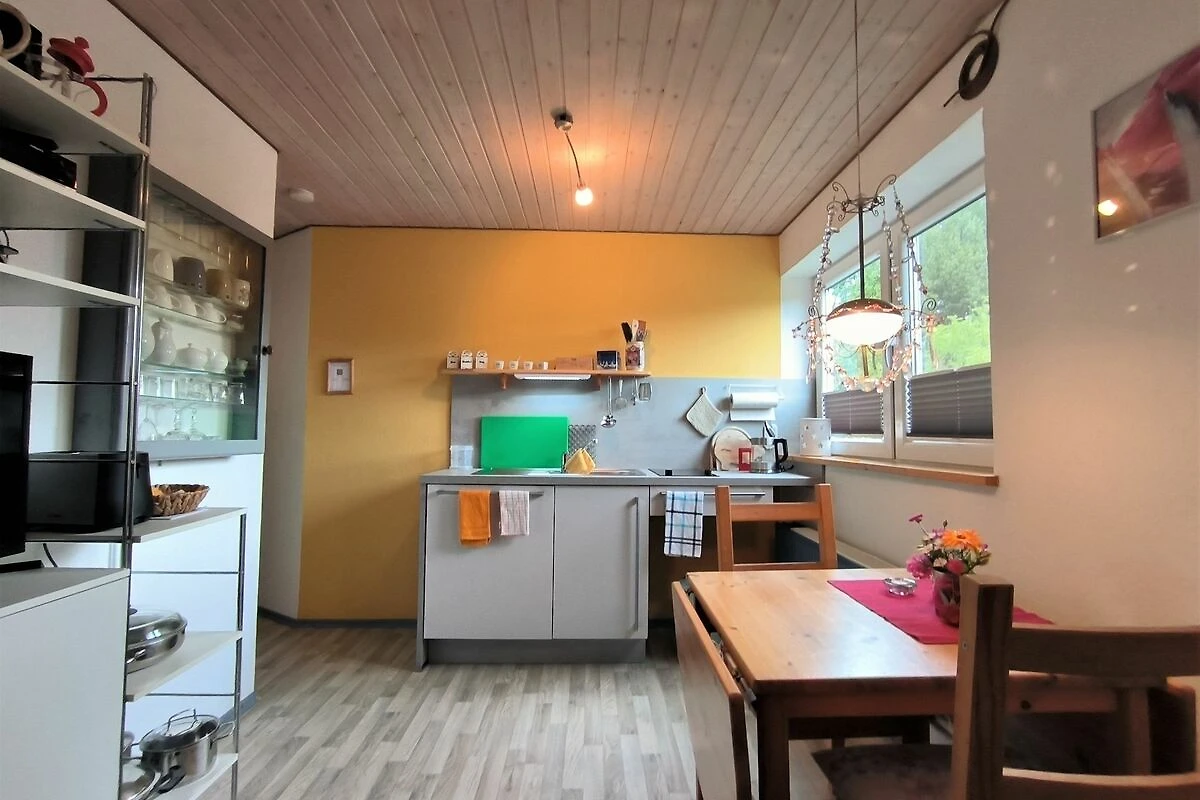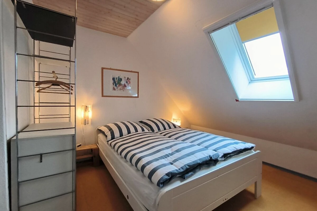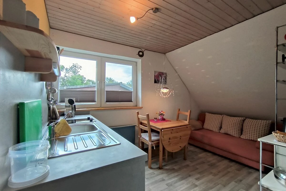 Man erreicht die Räumlichkeiten durch einen separaten Eingang über einen Gemeinschaftsflur, der z.T. an die Eigentümerwohnung grenzt, über eine schmale, steile Treppe. Im Eingangsbereich gibt es eine Sitzgelegenheit für die Gäste. Das Schlafzimmer für ein bis zwei Personen (1,40 x 2,00 m), eine kleiner Aufenthaltsraum mit Küchenzeile, Esstisch, Sofa und TV sowie ein Wannenbad befinden sich im Obergeschoss. Durch die offene Bauart ist die Unterkunft keine abgeschlossene Wohneinheit.