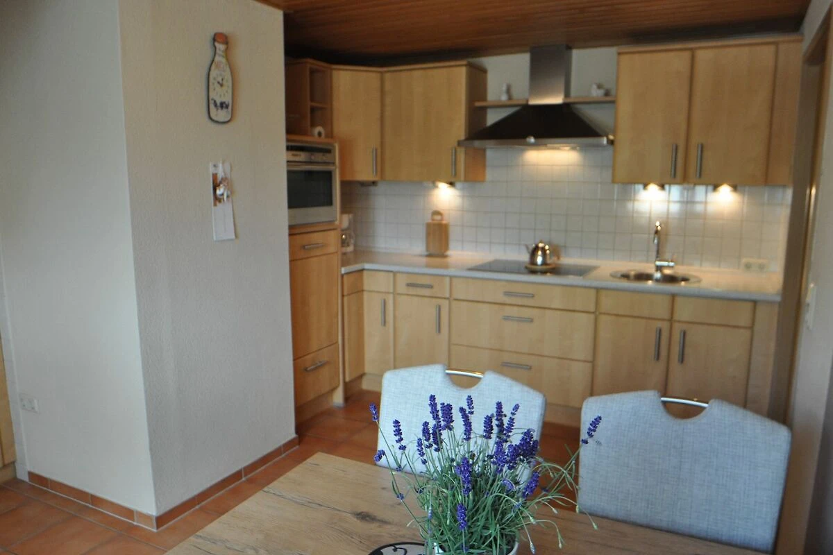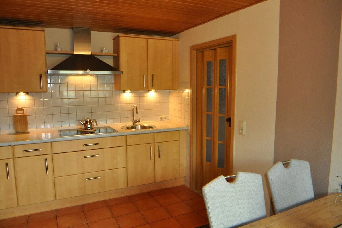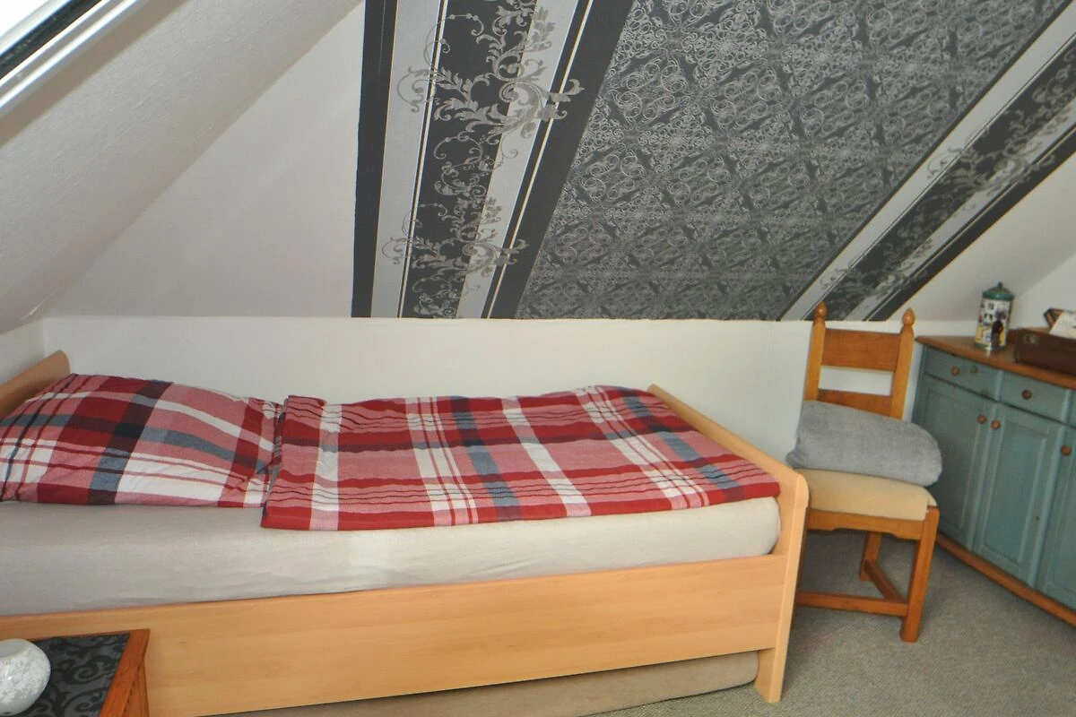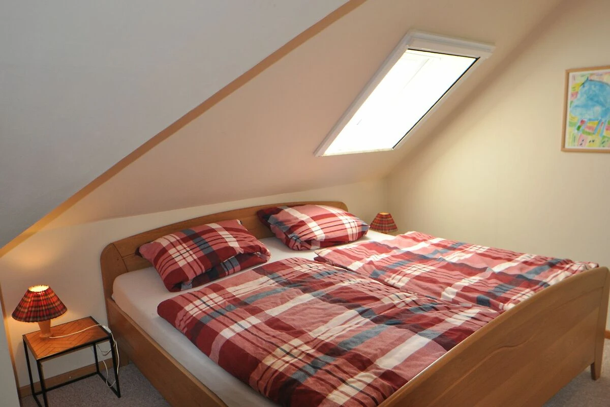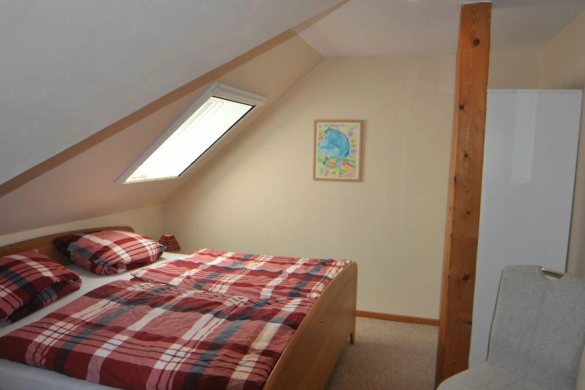 100 qm grosse Oberwohnung für bis zu drei Personen. Grosses Wohnzimmer mit Garnitur, Fernseher sowie einem Schreibtisch, komplett ausgestattete Einbauküche mit Spülmaschine und Essbereich für vier Personen, Badezimmer mit Badewanne/Dusche und WC sowie ein Schlafzimmer mit Doppelbett und ein Einzelzimmer mit Einzelbett (90 x 200 cm). Kinder-Reisebett steht zur Verfügung. Im Erdgeschoss befindet sich ein grosser Eingangsbereich mit Garderobe und Schuhablage. Alle Fenster sind mit Fliegengittern und Aussenjalousien ausgestattet.