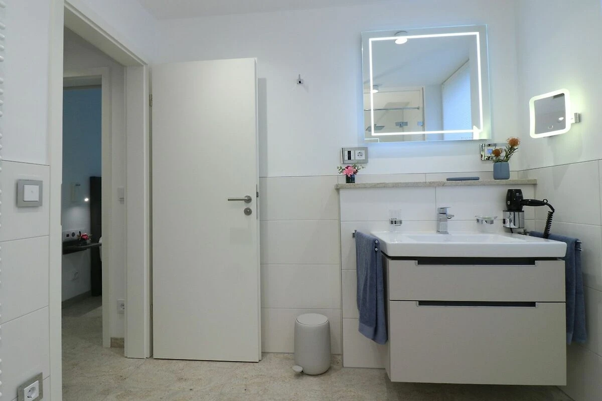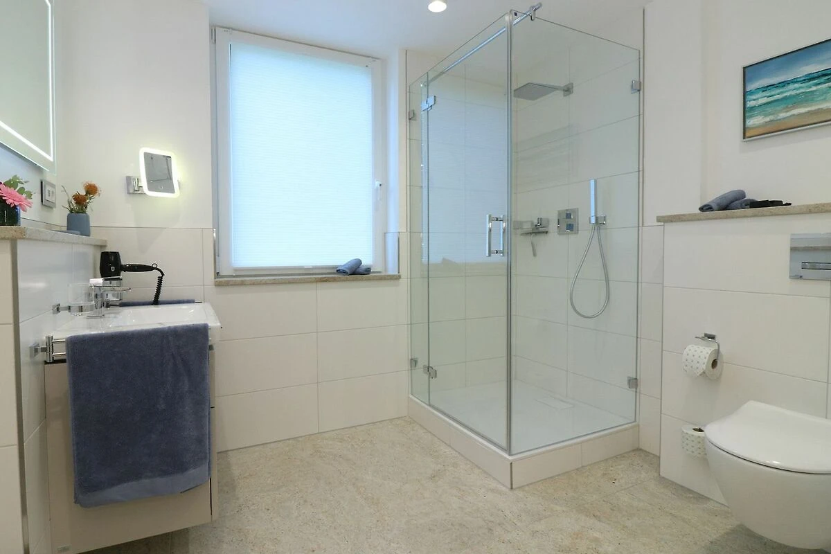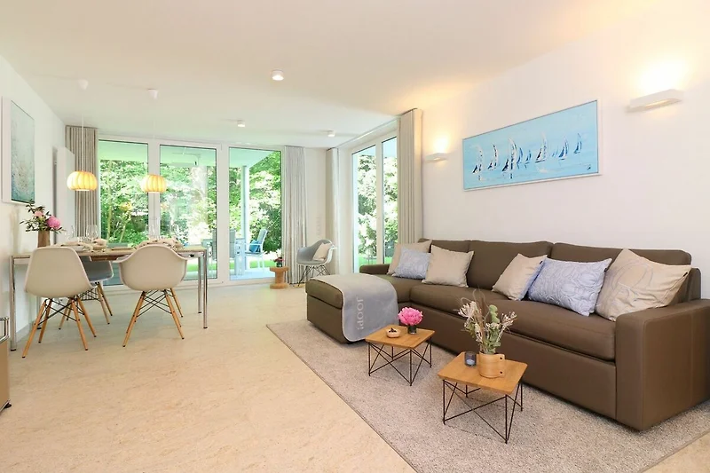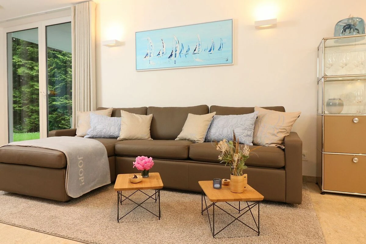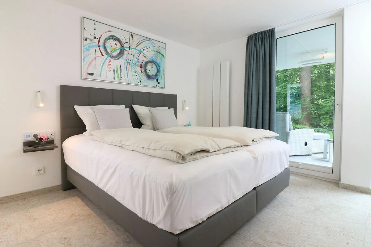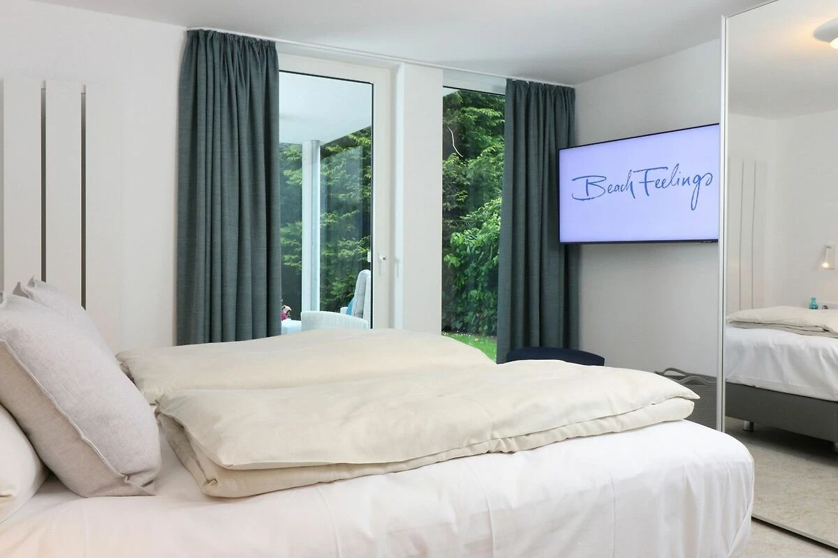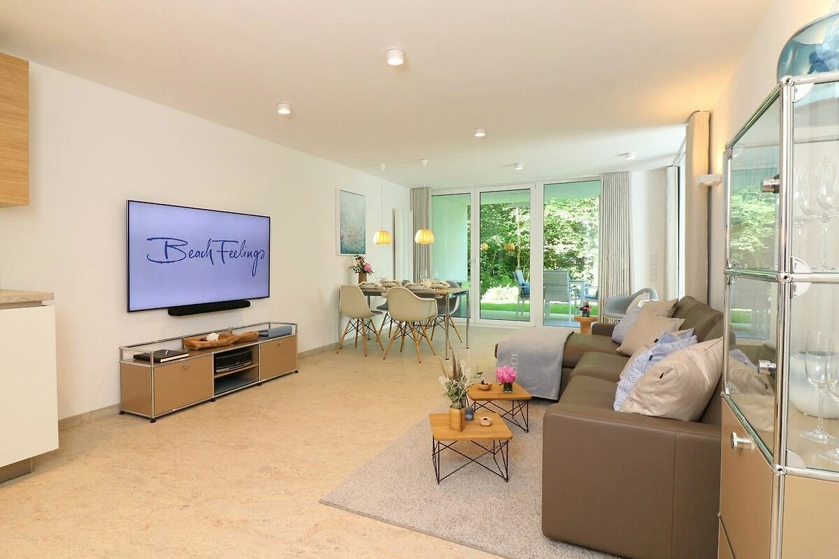 Strandnahe und grosszügige 2-Zimmer-Ferienwohnung 67 m² im EG, mit Fahrstuhl zur Tiefgarage. Zwei überdachte Süd/Süd-West-Terrassen, exklusive Designer-Möbel, Wellnessbad mit Regendusche, inkl. Strandkorb (saisonbedingt 15.05. 15.09.) und kostenlosem 500-Mbit-Highspeed-WLAN, Tiefgaragen-Stellplatz (Höhe 2,00 m), E-Ladung gegen Gebühr möglich (11 kW Ladeleistung, Typ-2-Steckdose).
