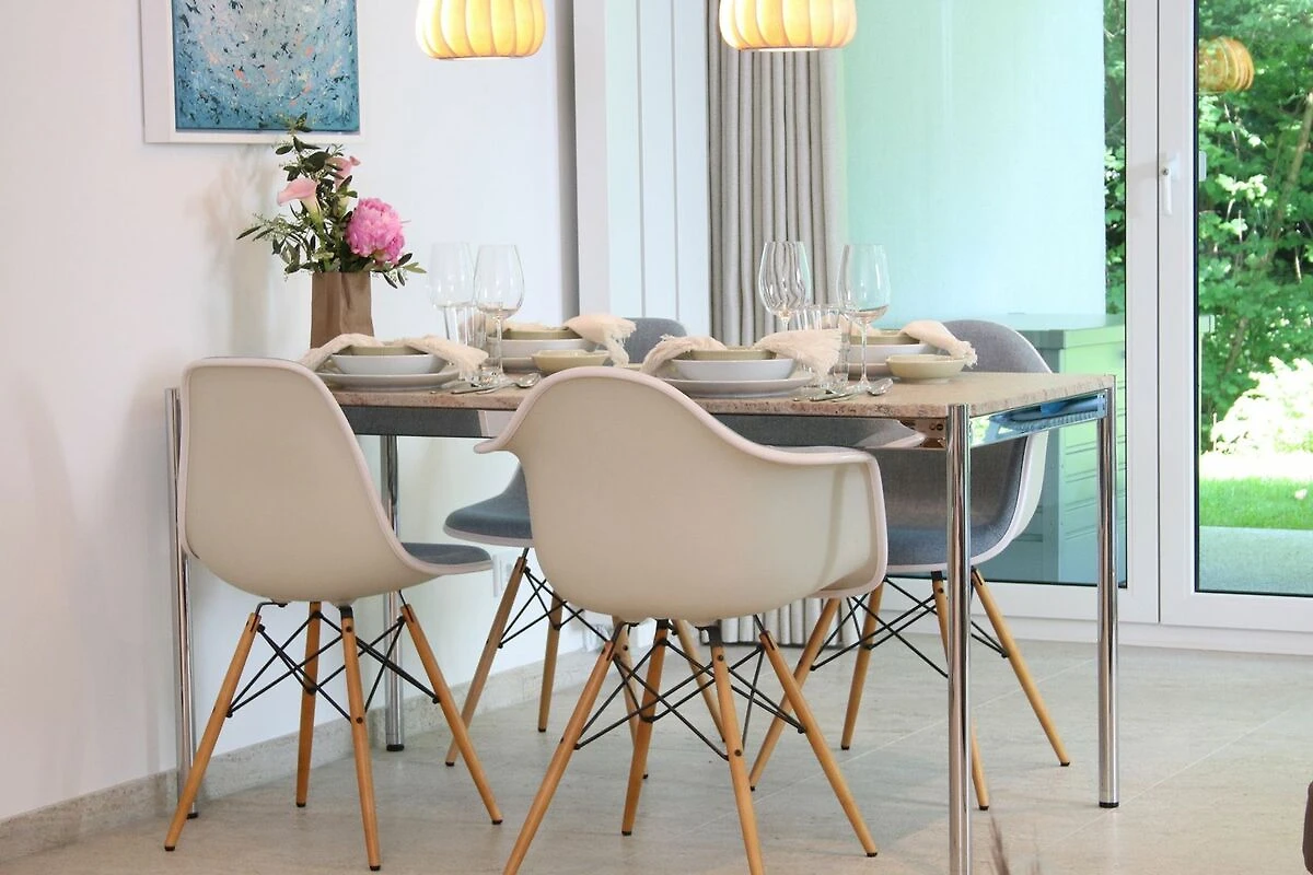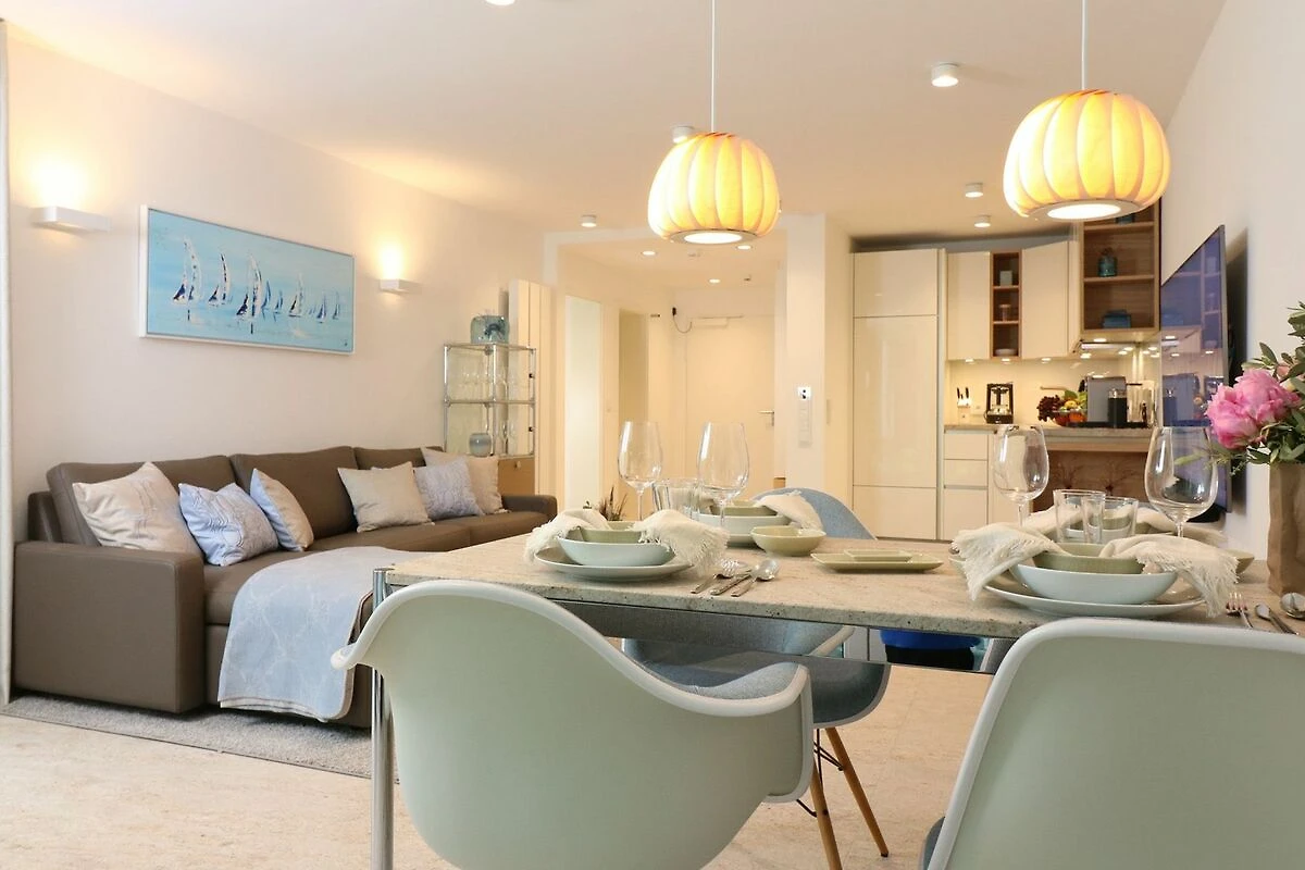 Die strandnahe, 67 m² grosse und exklusive Design-Ferienwohnung erwartet Sie mit hellen und warmen Farbtönen in allen Räumen. Das abgestimmte Wohnraumkonzept von COR, USM, VITRA und JAB wird mit einem Wellnessbereich von Villeroy [&] Boch ergänzt. Das harmonische Lichtkonzept des Hauses Prediger schafft eine warme Atmosphäre und setzt die originalen Acrylbilder und stylische, naturbelassenen Dekorationen ins richtige Licht.