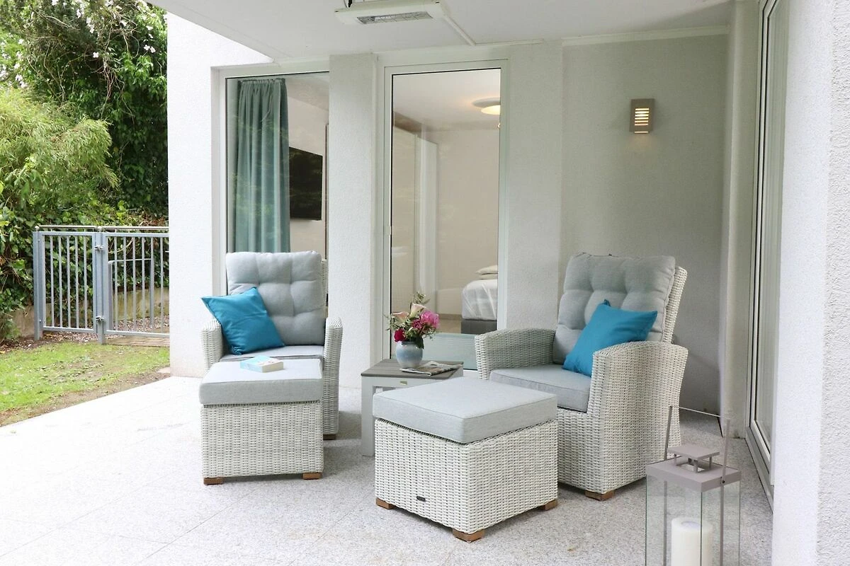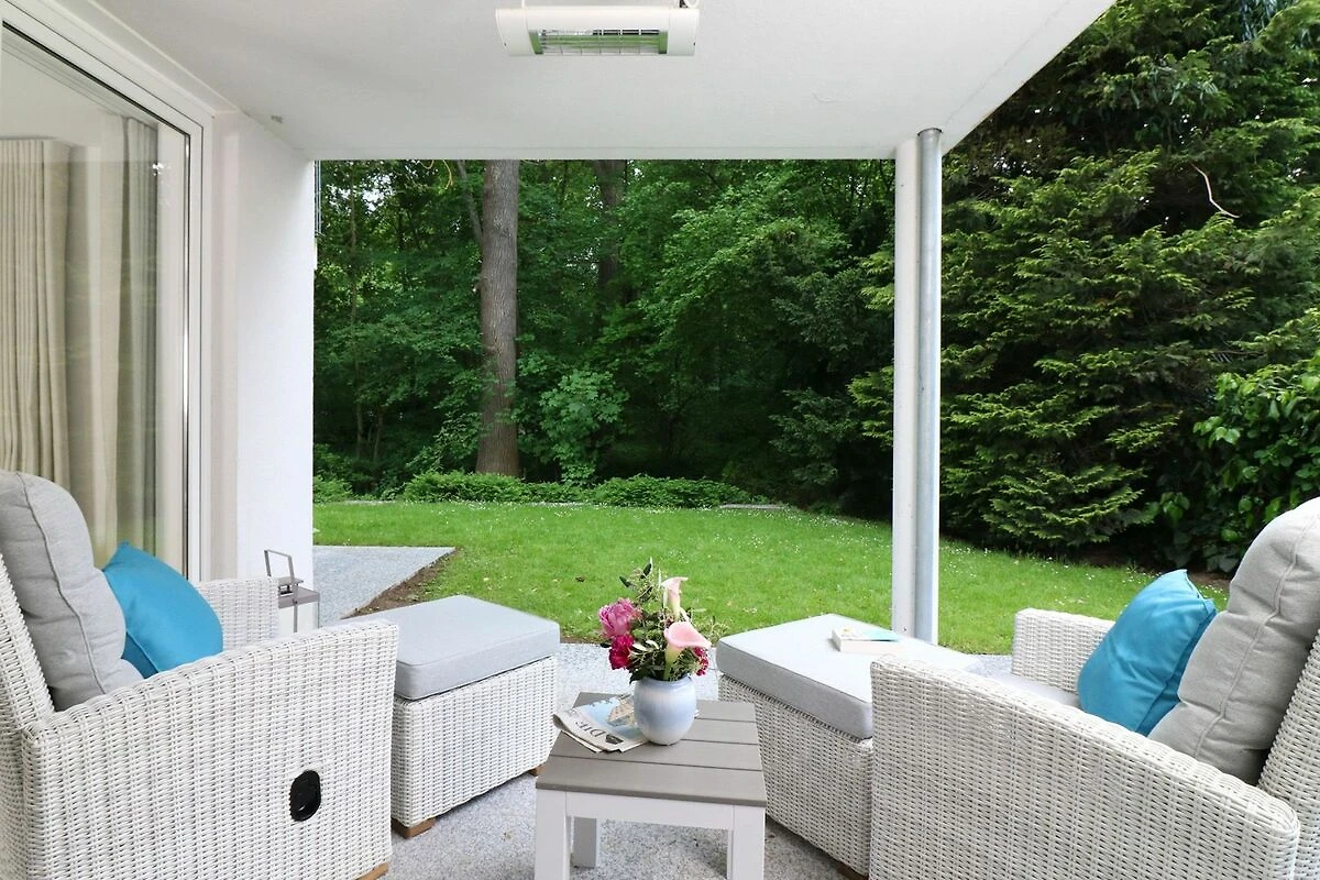 Terrassen: Die beiden überdachten Terrassen liegen in ruhiger und grüner Umgebung und sind auch an etwas kühleren Tagen durch Infrarot-Terrassenstrahler ein schöner Rückzugsort zum Entspannen. Es erwarten Sie hier bequeme, verstellbare Liegesessel und eine Esstischgruppe. Von der Terrasse aus haben Sie einen kleinen seitlichen Blick auf die Ostsee.