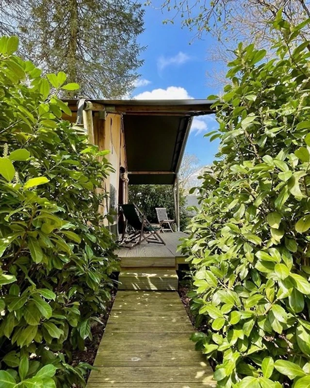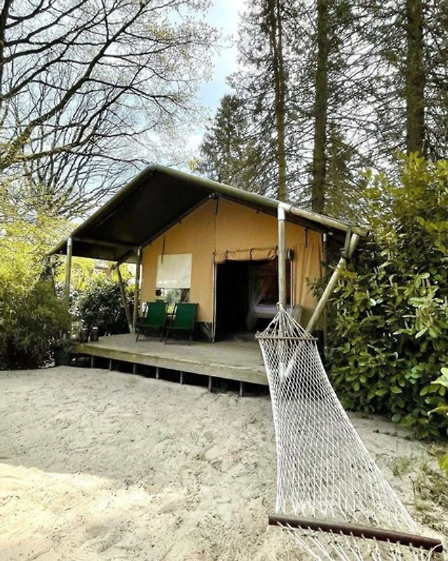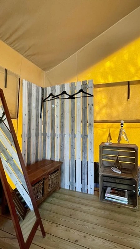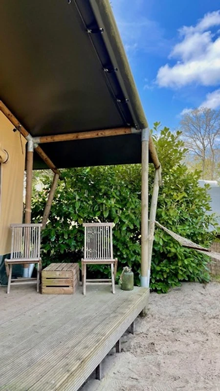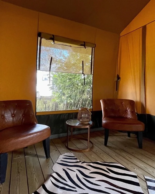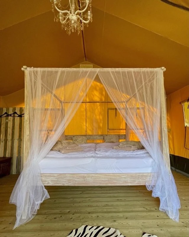 Das Safari Zelt verfügt über ein Himmelbett, Kronleuchter, Essecke, Loungesessel, eine überdachte Aussenterrasse.