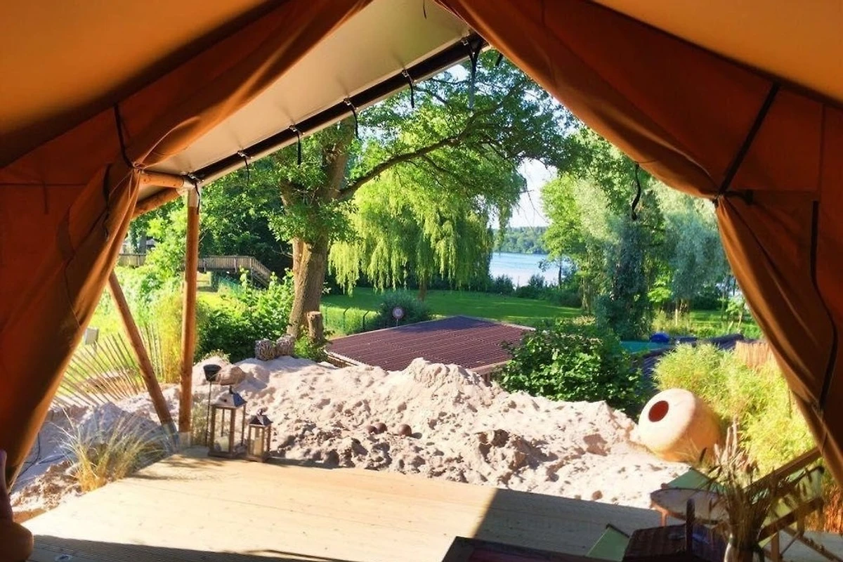 Neben der überdachten Terrasse befindet sich eine eigene kleine Sanddüne mit Sonnenliegen und natürlich einen traumhaften Seeblick.