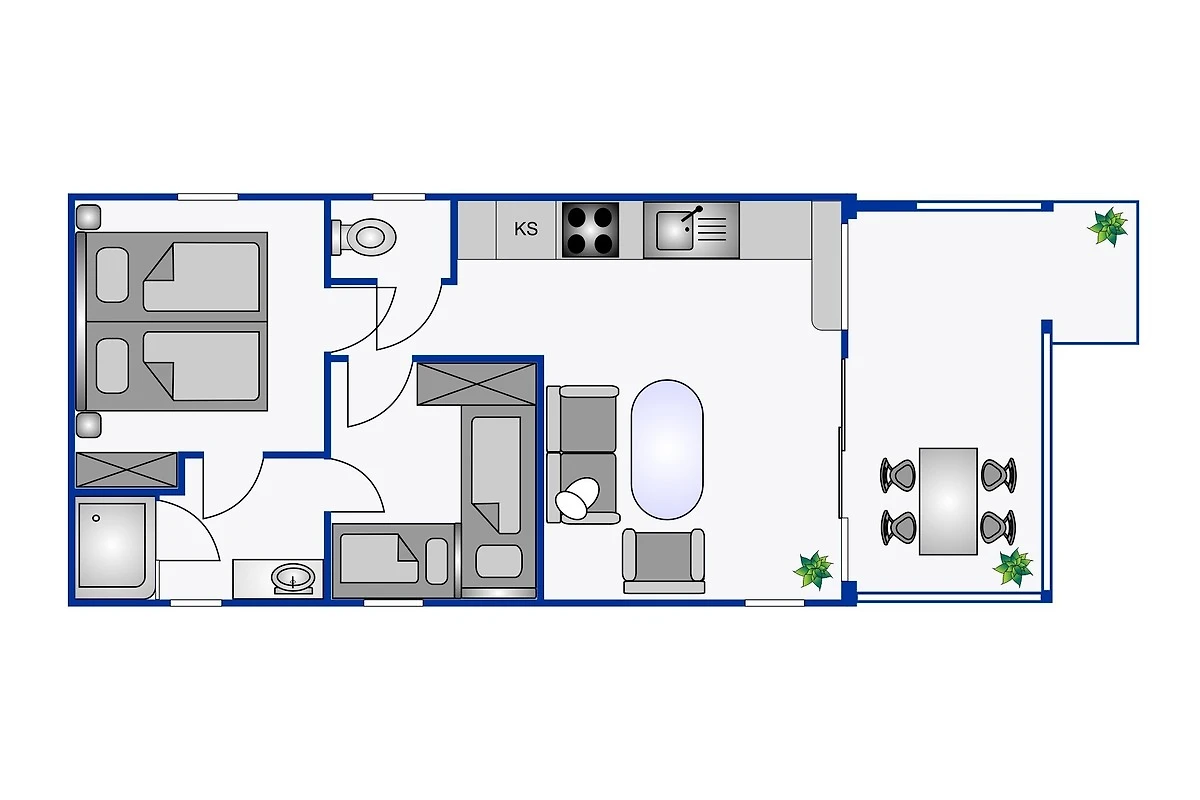 Das Boje Ferienhaus ist ein 3-Zimmer-Haus mit 30 qm Wohnfläche, Parterre. Wohn-/Schlafraum mit Esstisch, Küchenzeile. Bad: Du, Wb, WC, Föhn. Terrasse mit Sitzmöbeln, Grill. Strandkorb beim Haus.