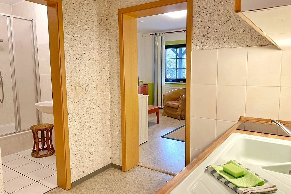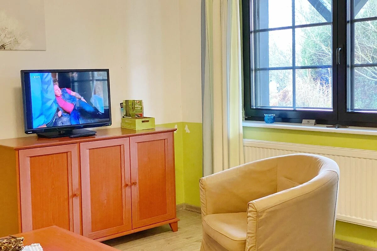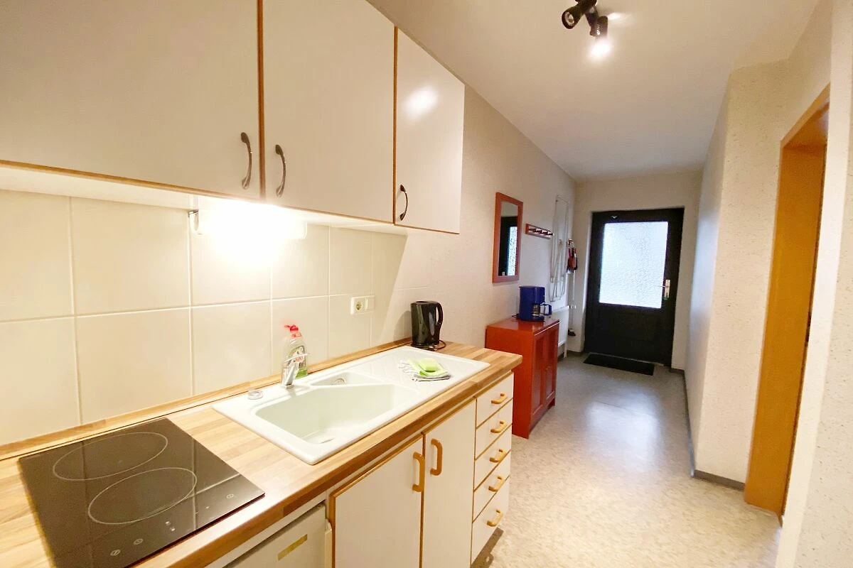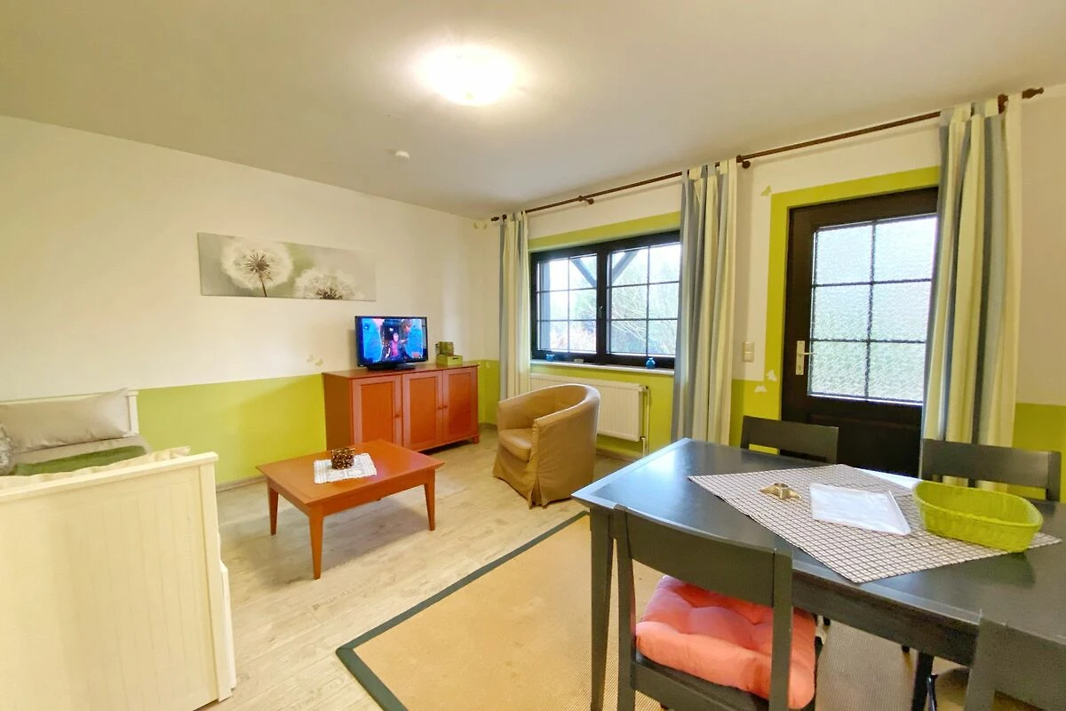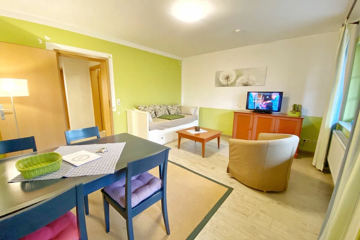Die gemütliche Ferienwohnung hat eine Grundfläche von ca. 40 m² und verfügt über einen Wohnraum mit Doppelbettcouch und Flachbild-TV, einen Schlafraum mit Doppelbett, einen Flur mit Miniküche (Kühlschrank, 2 Kochplatten, Kaffeemaschine, Wasserkocher, Toaster) und natürlich ein Bad mit Dusche mit WC. Sie befindet sich im Erdgeschoss und hat einen direkten Zugang über die Terrassentür nach draußen. Hier können Sie den erlebnisreichen Urlaubstag ausklingen lassen.