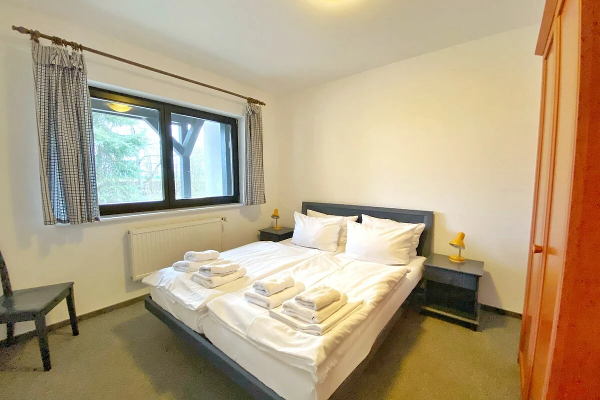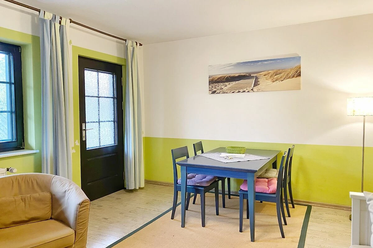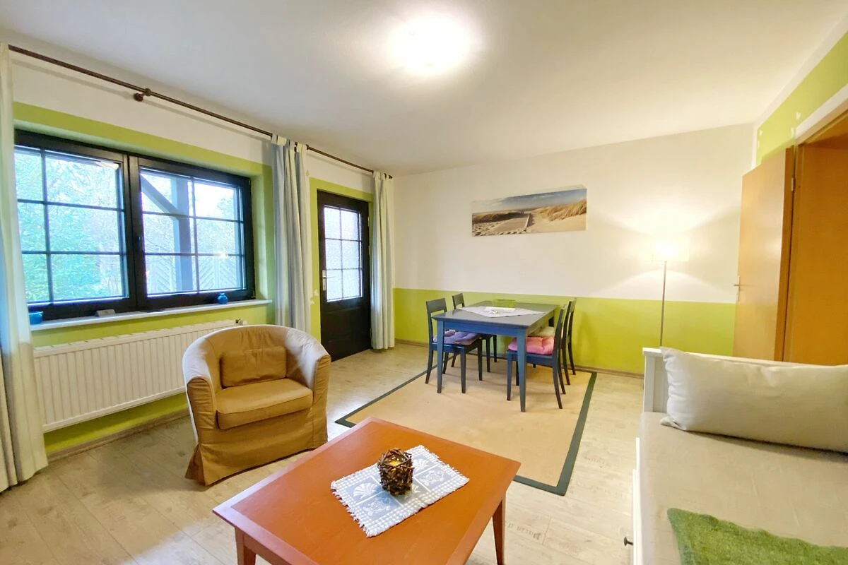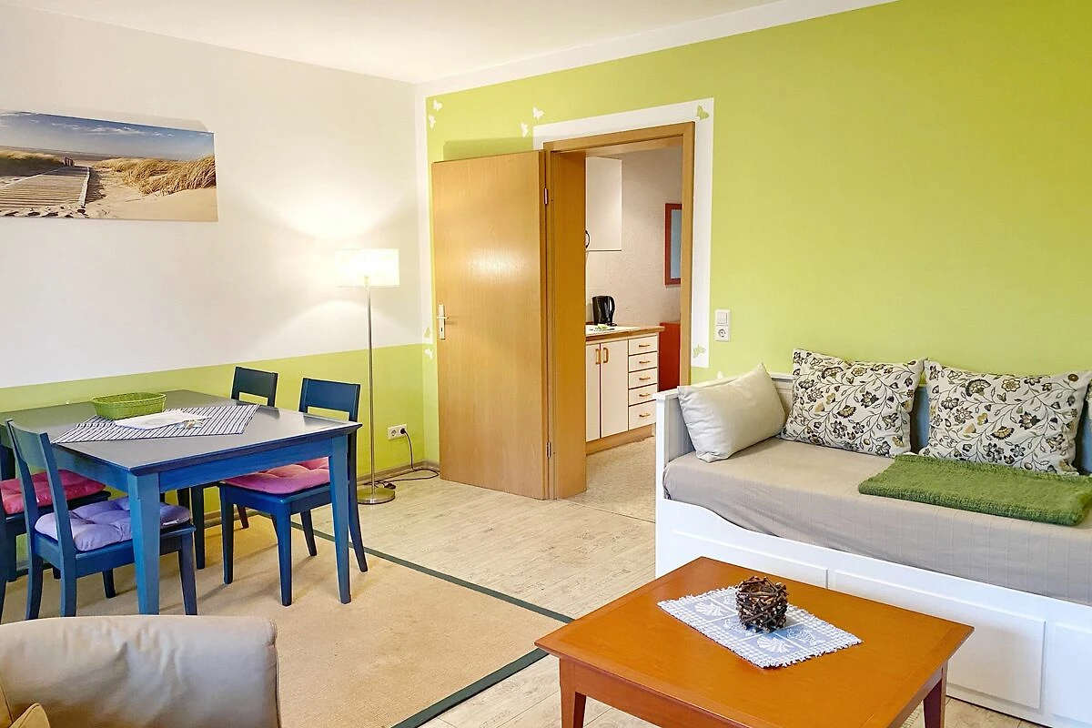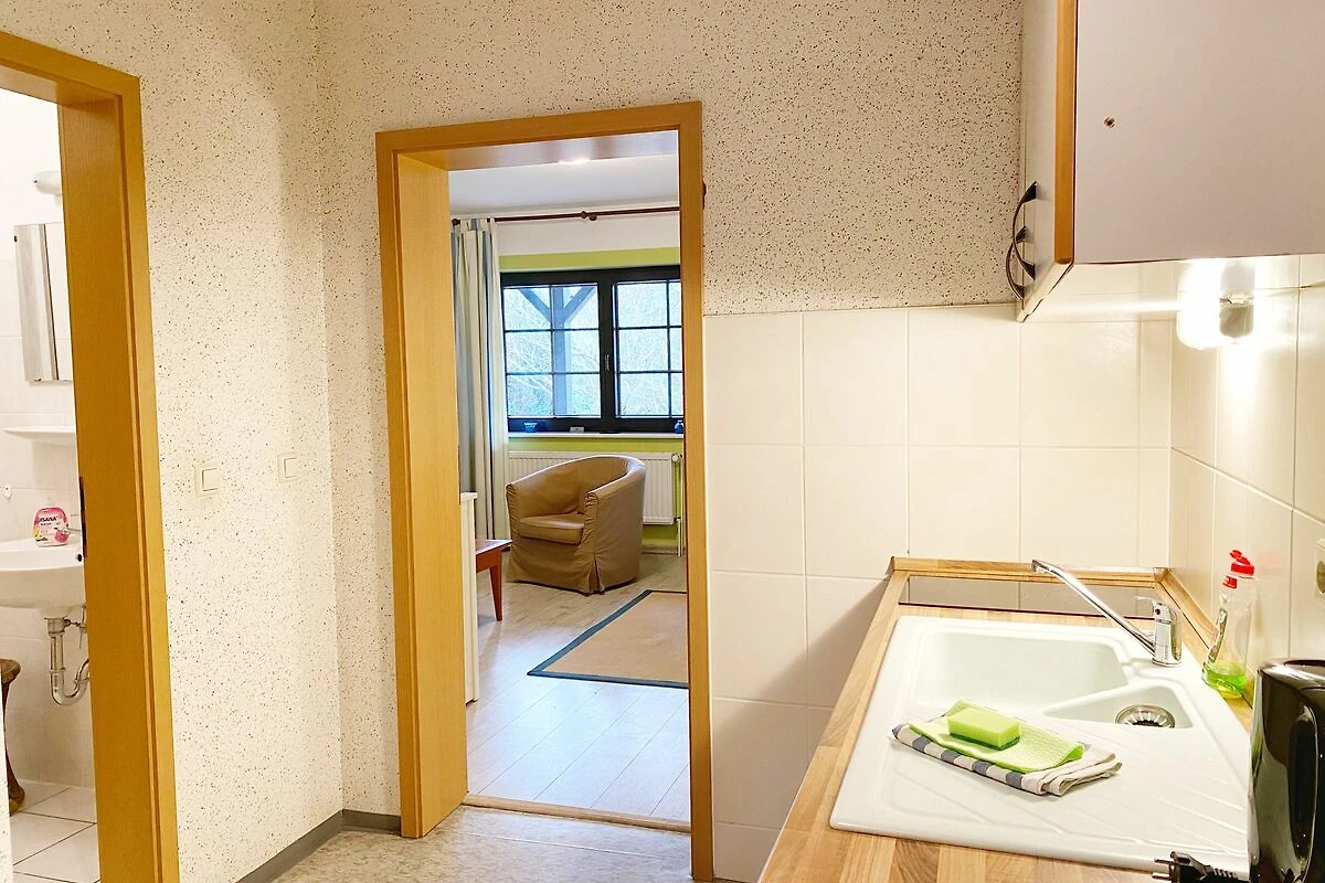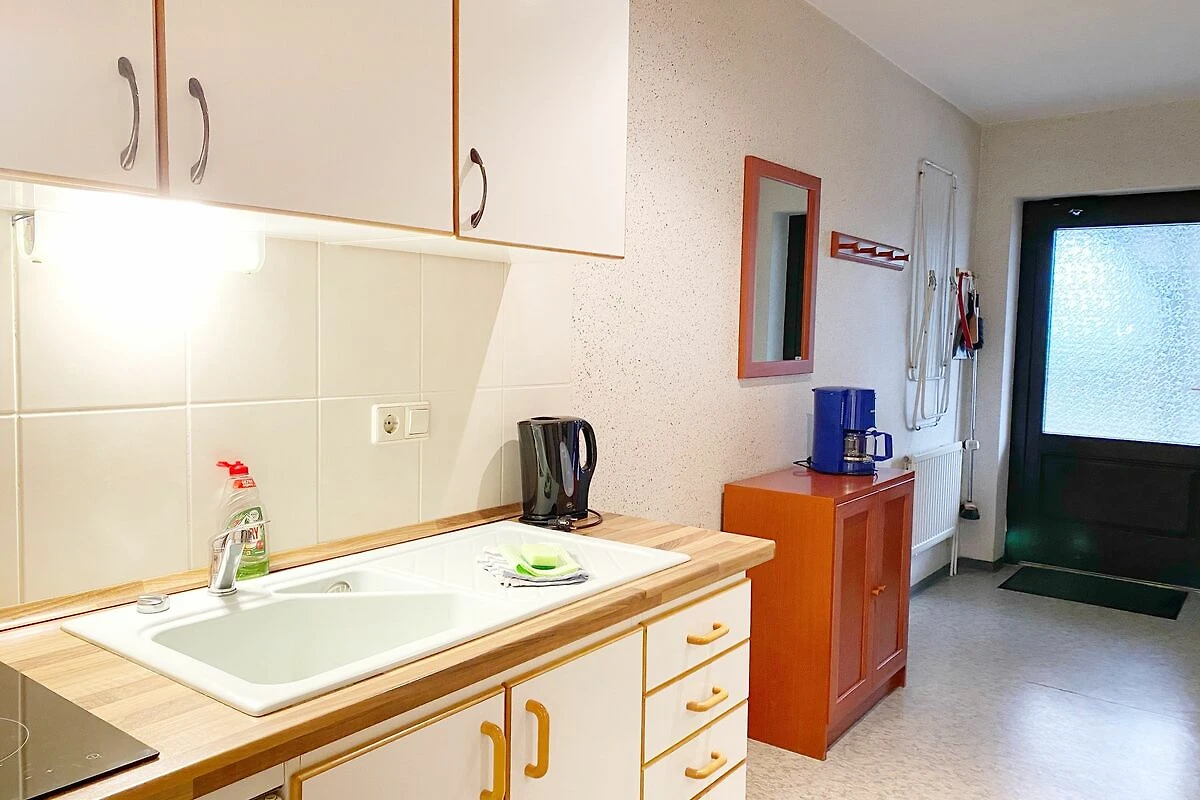 Die gemütliche Ferienwohnung hat eine Grundfläche von ca. 40 m² und verfügt über einen Wohnraum mit Doppelbettcouch und Flachbild-TV, einen Schlafraum mit Doppelbett, einen Flur mit Miniküche (Kühlschrank, 2 Kochplatten, Kaffeemaschine, Wasserkocher, Toaster) und natürlich ein Bad mit Dusche mit WC. Sie befindet sich im Erdgeschoss und hat einen direkten Zugang über die Terrassentür nach draußen. Hier können Sie den erlebnisreichen Urlaubstag ausklingen lassen.