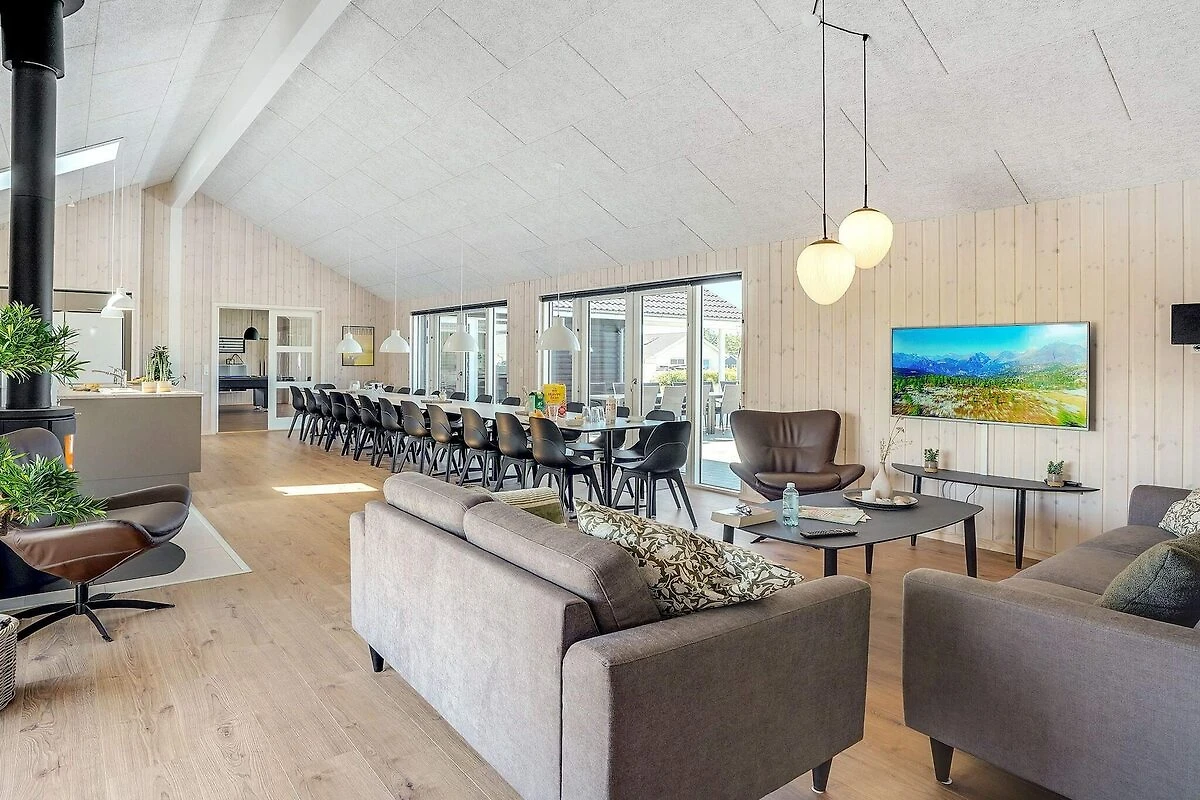 Geräumiges Ferienhaus für 26 Personen mit Swimmingpool, Whirlpool, Sauna und Aktivitätsraum am Limfjord, nur eine kurze Autofahrt von der Marktstadt Skive entfernt. Wenn Sie gerne schwimmen, ist der eigene Badebereich des Ferienhauses ideal. Hier finden Sie den beheizten Swimmingpool des Ferienhauses mit Wasserrutsche, Gegenstromanlage und römischer Treppe. Nach dem Schwimmen im Pool können Sie ein Bad im Whirlpool oder in der Sauna genießen – vielleicht ein noch größerer Hit bei den älteren Mitgliedern der Gruppe? Die vielen Möglichkeiten des Ferienhauses setzen sich im Aktivitätsraum fort. Hier können Sie Billard, Tischtennis, Tischfußball und Darts spielen. Während die Spieler mit den verschiedenen Aktivitäten beschäftigt sind, können die Zuschauer einen Drink an der Bar des Raumes genießen. Wenn Sie Lust auf einen Film haben, können Sie dies auf der Sofaecke tun, die mit einer PlayStation 4 ausgestattet ist. Insgesamt verfügt das Luxushaus über zehn Schlafzimmer, verteilt auf drei Schlafbereiche mit jeweils eigenem Bad. Auf dem Dachboden im Aktivitätsraum befinden sich sechs zusätzliche Schlafplätze, wo besonders die kleinen Gäste gerne übernachten. Das Herzstück des Ferienhauses, die große Wohnküche, bietet viel Platz für große Festessen. Köche können in der gut ausgestatteten Küche mit zwei Geschirrspülern, zwei Backöfen, zwei Spülbecken, zwei Kühlschränken und einem zusätzlichen Herd ein Abendessen für 26 Personen zaubern. Zum Servieren und Genießen finden 26 Personen am langen Esstisch Platz. Die große offene Küche ist mit dem hellen Wohn- und Aufenthaltsraum verbunden, wo der Holzofen an kühleren Tagen für wohlige Wärme sorgt. Die Terrasse des Ferienhauses ist teilweise überdacht und kann daher auch bei Regen genutzt werden. Auf der Terrasse befinden sich außerdem zwei Grills, an denen Sie das Abendessen zubereiten können, während die Kinder im Garten auf dem Bodentrampolin springen (Benutzung auf eigene Gefahr/Versicherung). Direkt am Haus befindet sich außerdem eine Ladestation für Elektroautos. Nicht zur Vermietung an Jugendgruppen verfügbar.