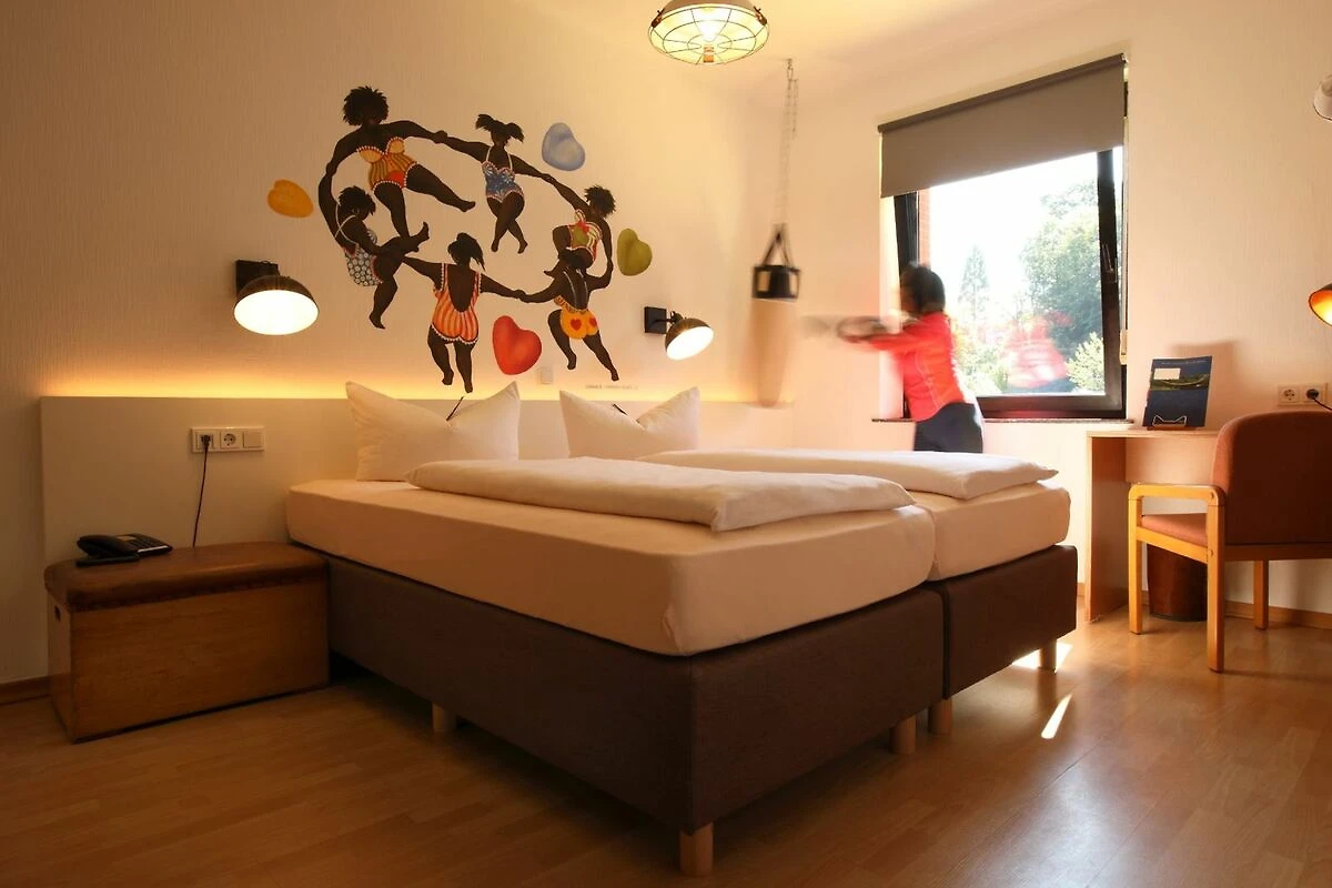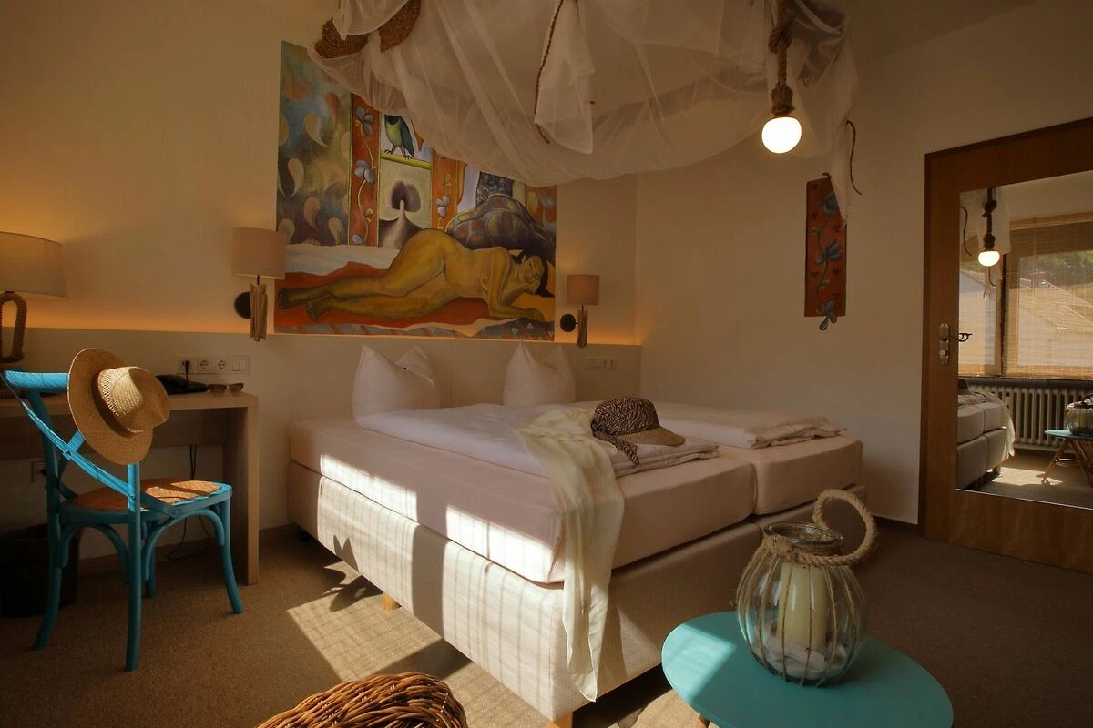 Neun individuell und liebevoll eingerichtete Themenzimmer, modern und komfortabel ausgestattet. Kreativ und immer mit einem kleinen Augenzwinkern wurden Themenzimmer, wie z.B. 7. Himmel, Fitnessraum, Südsee, Ladylike oder Bernsteinzimmer eingerichtet. Gehen Sie auf Entdeckungsreise nach den vielen kleinen Details in den Zimmern. Das Gute-Laune-Bio-Vital-Frühstücksbuffet macht Sie fit für den Tag. Grosse abschliessbare Fahrradgarage für 20 Räder mit Lademöglichkeiten für E-Bikes. Parkmöglichkeiten direkt am Haus.