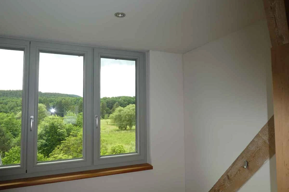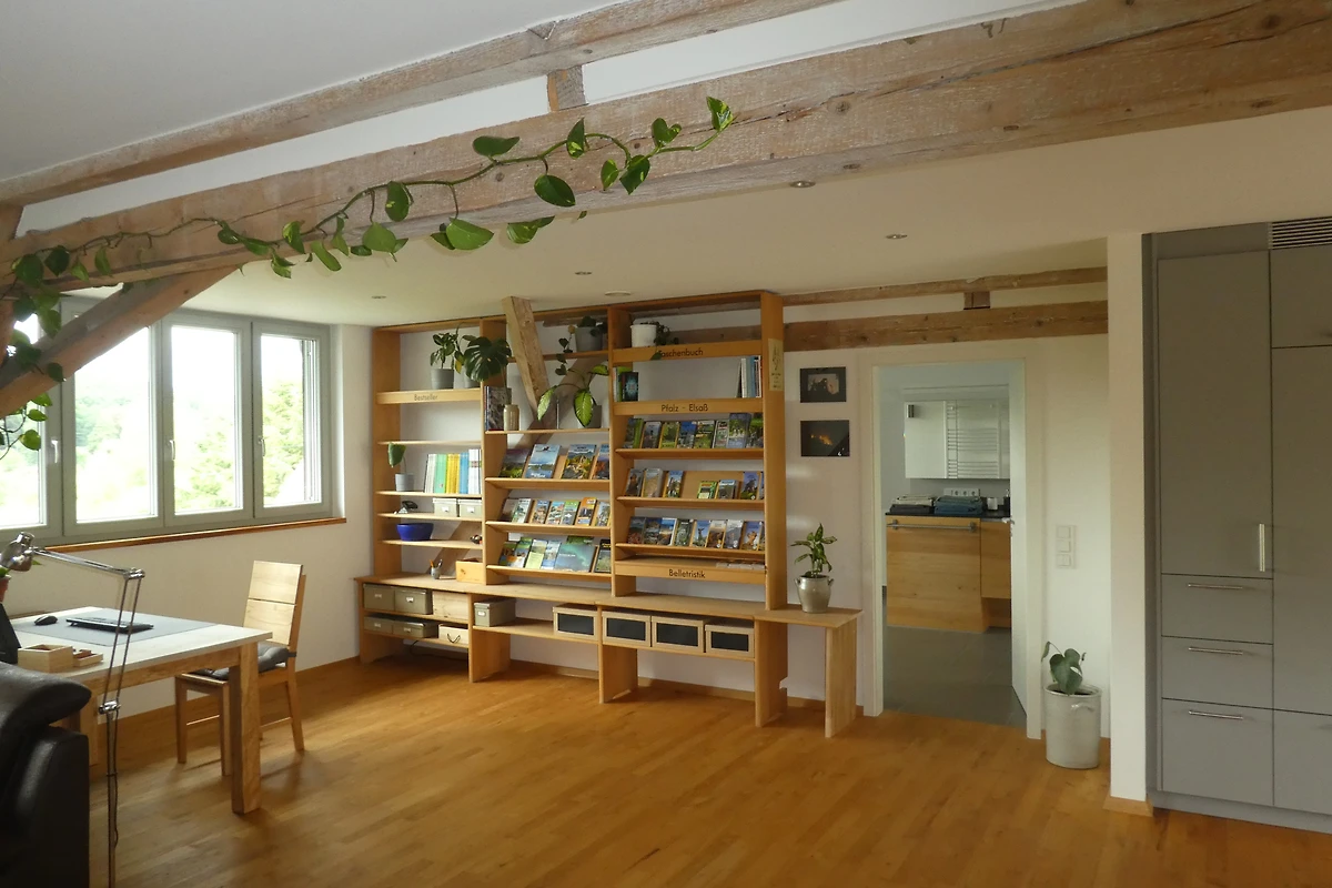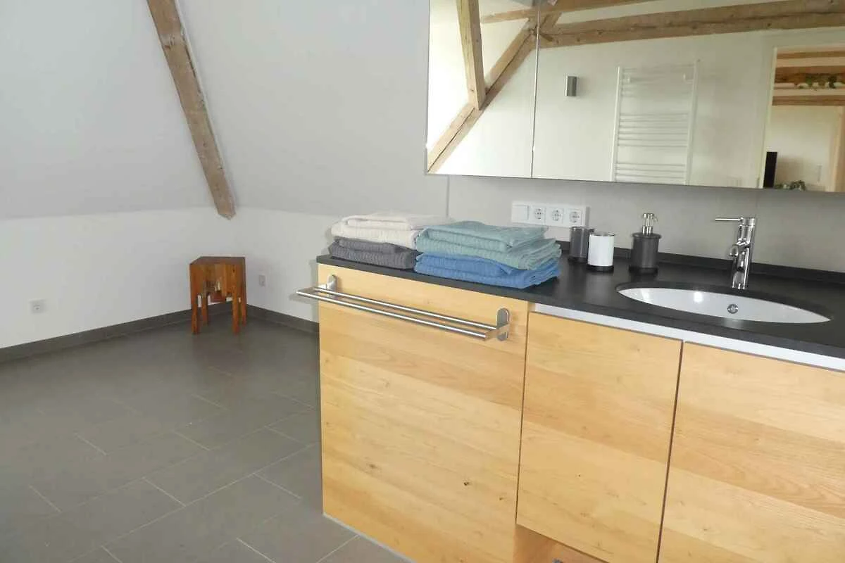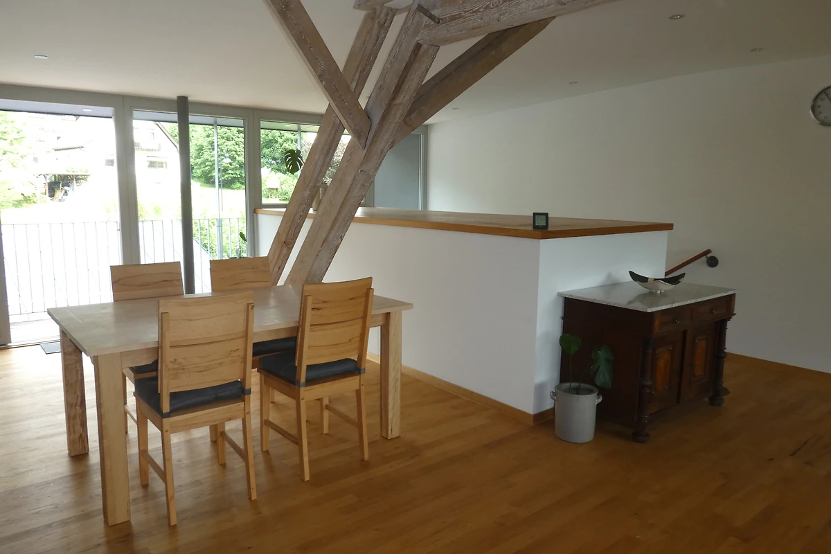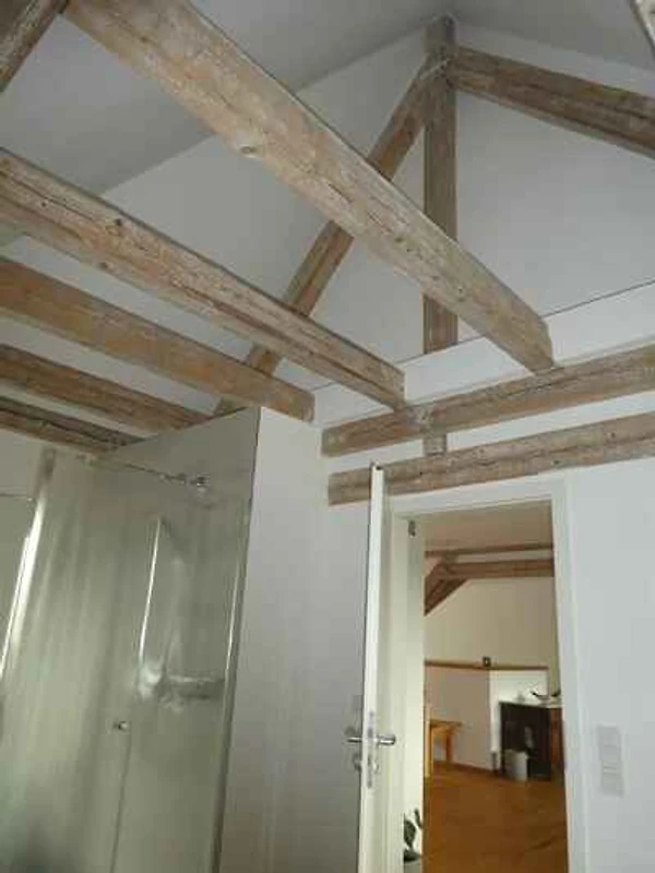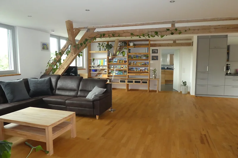 Der Eingang in Ihre Ferienwohnung befindet sich in der 2. Etage, ist überdacht und führt über 32 Stufen direkt in den Vorraum. Die Wohnung hat einen offenen Loftcharakter. Wohnküche (65 qm) mit Sitzecke, TV, Radio, Stereoanlage, CD-Player, Essecke (4 Plätze), Zugang zur Loggia (4 qm, überdacht, Gartenmöbel, 2 Tische, 8 Stühle, gemeinsam mit Wohnküche) und Der Wohn-, Ess- und Küchenbereich ist offen und misst insgesamt 71 qm. Der zweite Tisch kann für Büroarbeit genutzt werden. Schlafzimmer (12 qm) mit 1 Doppelbett. Schlafzimmer (23 qm) mit 1 Doppelbett und Zugang zur Loggia (Gartenmöbel). Küche (10 qm) mit Essecke (4 Plätze), Elektroherd (Cerankochfeld, 4 Platten), Backofen, Dunstabzugshaube, Geschirrspüler, Kühlschrank (180 l, Eisfach), Mikrowelle, Kaffeemaschine, Toaster und elektrischem Wasserkocher. Vorraum (7 qm) mit Der Vorraum dient u.a. als Garderobe. Bad (23 qm) mit Badewanne mit Duscheinrichtung, Waschmaschine, Dusche, 1 Waschbecken, WC, Föhn, Fenster und Es gibt neben dem WC im Bad noch ein separates WC.