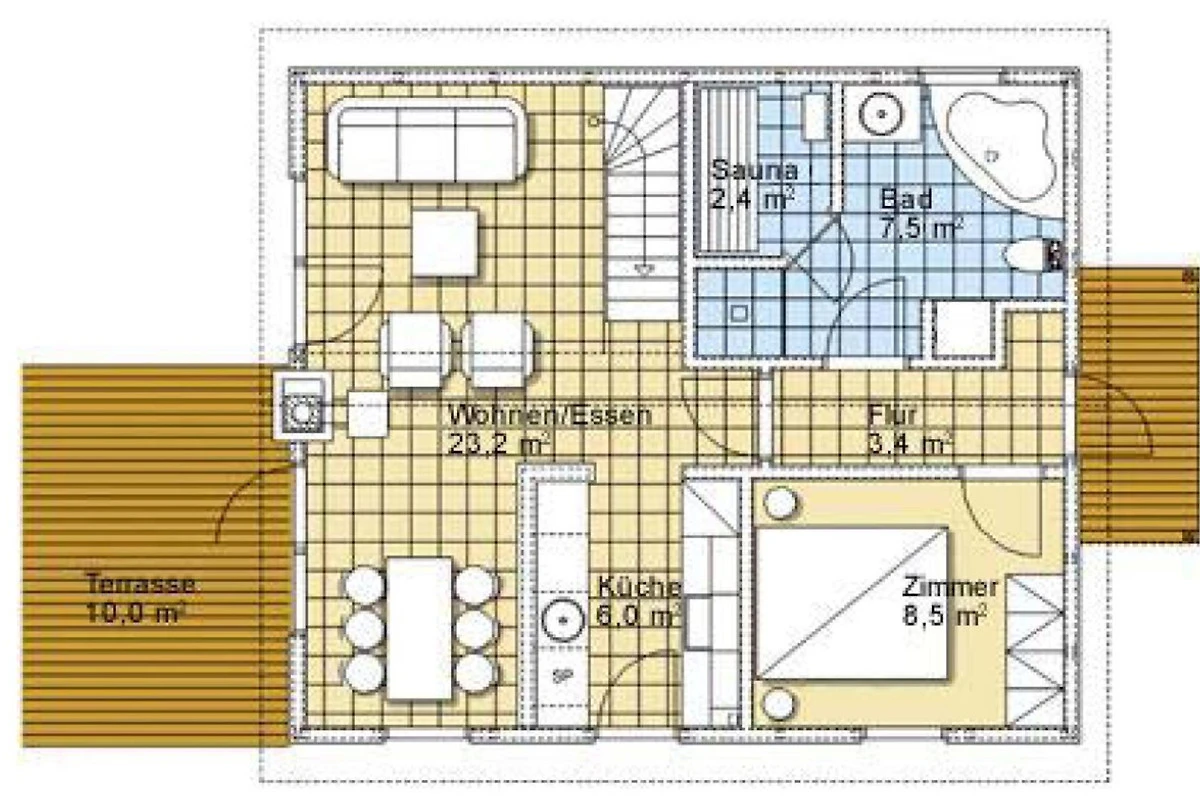 Ausserdem befindet sich auf der Galerie bei Bedarf eine zusätzliche Schlafmöglichkeit (Schlafsofa) für 2 Kinder.