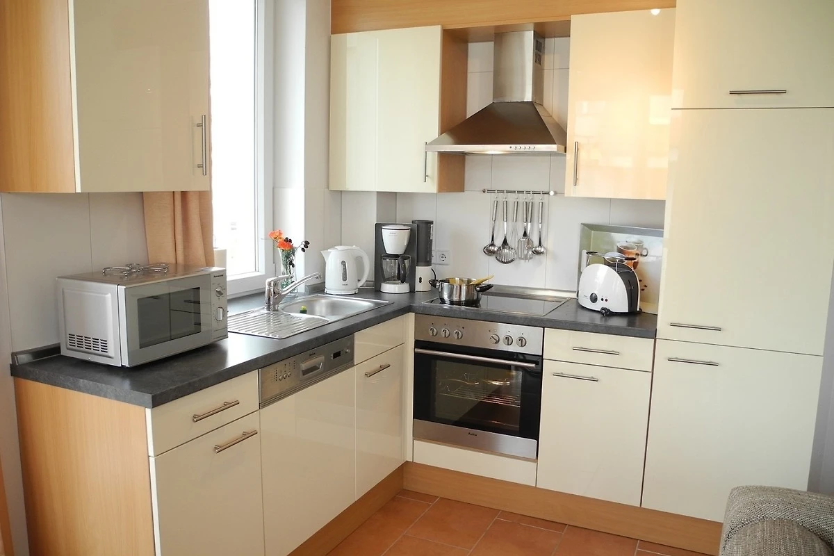 Unsere komfortable Ferienwohnung verfügt über eine offene Wohnküche mit Spülmaschine und Cerankochfeld und mit offenem Essbereich.
