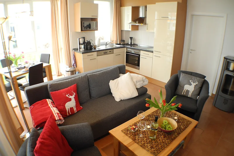 Ein schönes Bad mit Wellnessdusche, eine voll ausgestattete Küche und ein grosser Wohnraum mit Kaminofen und Essecke laden zum Wohlfühlen ein.