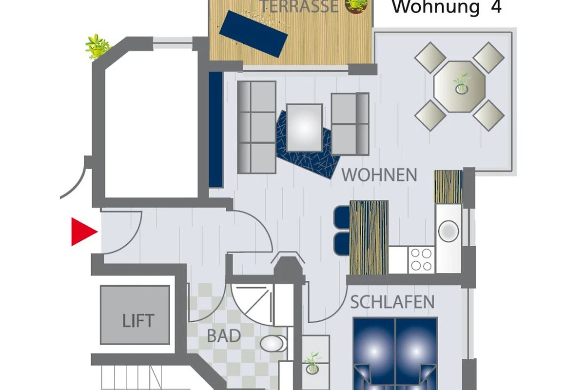 Die Wohnung befindet sich im Erdgeschoss. Die Terrasse ist nach Nord-Westen ausgerichtet.