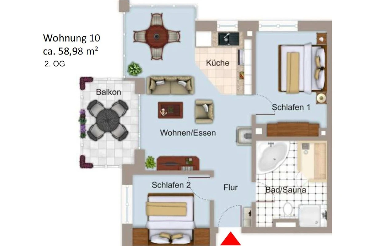 Die grosszügige und hochwertig ausgestattete Wohnung liegt im zweiten Obergeschoss, ist ca. 60 qm gross und lässt kaum Wünsche offen. Unsere Wohnung besteht aus einem Wohn-/Essbereich mit integrierter Küchenecke, zwei Schlafzimmern sowie einem Badezimmer.