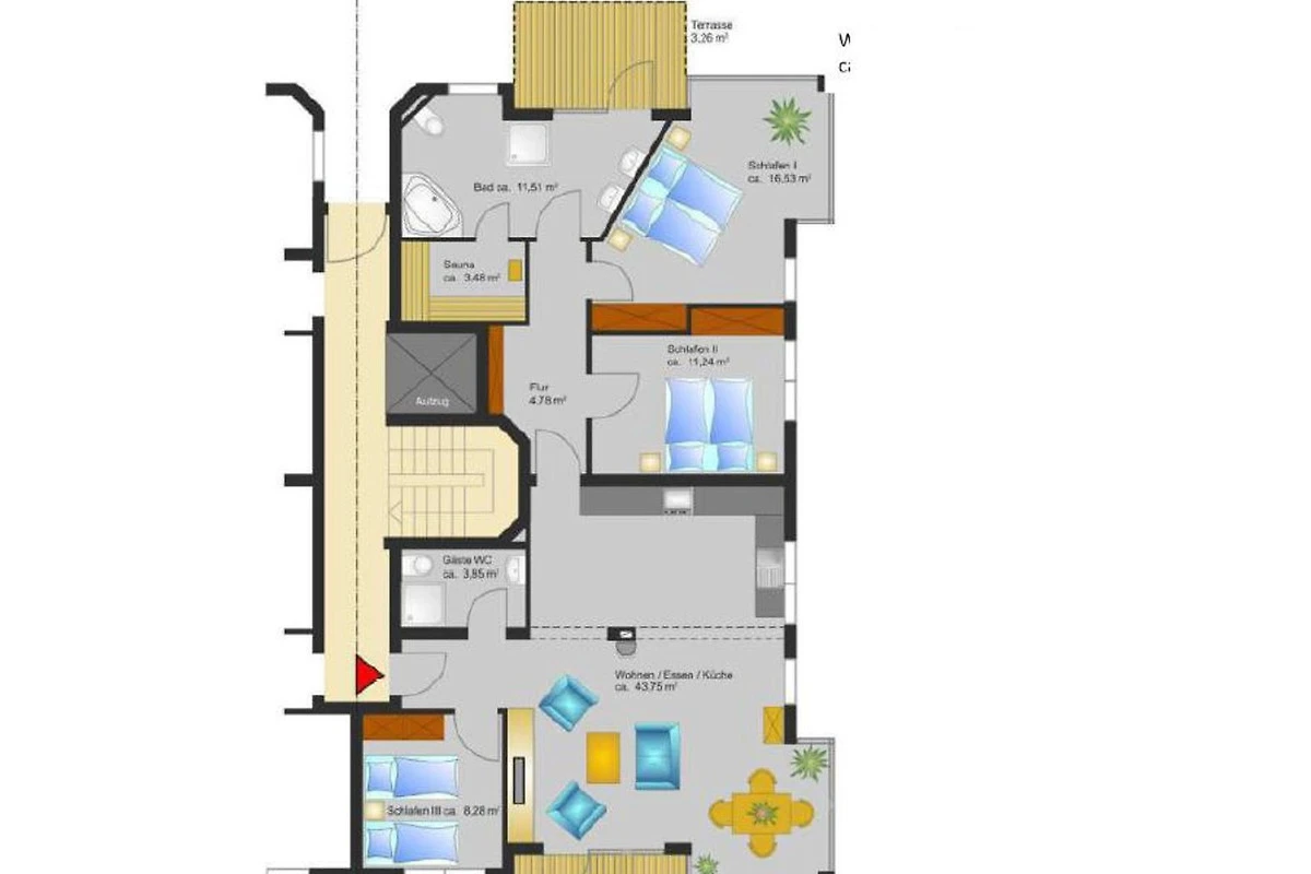 Sie finden 3 Schlafzimmer, 2 Bäder davon ein Wellnessbad mit einer Grösse von 15 qm, eine grosse Sauna, 2 Terrassen und ein besonders grosszügigen Wohn-Essbereich sowie einen eigenen Parkplatz vor. Ca. 108 m² Raum für Ihre Entspannung. Egal, ob Sie mit Ihrer Familie oder Freunden kommen, hier findet jeder seinen Platz.