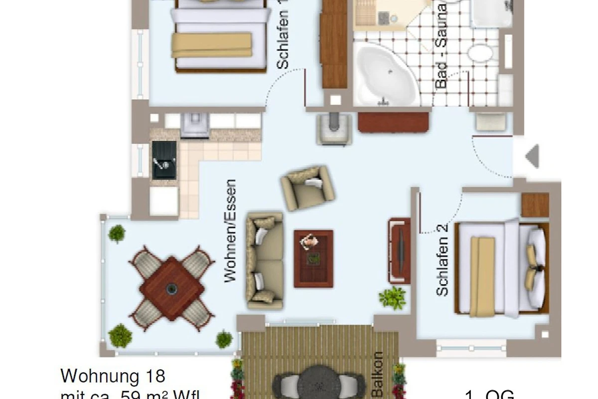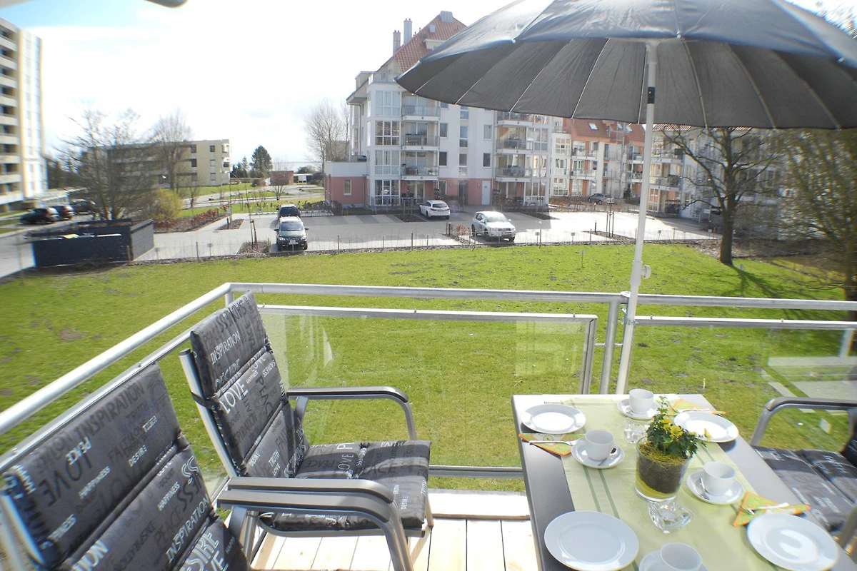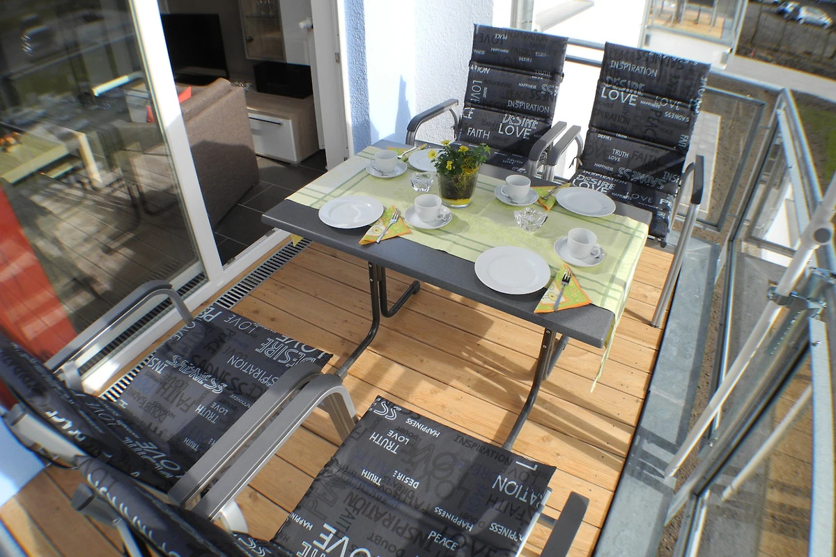 Dem Wohnzimmer schliesst sich der nach Süden ausgerichtete Sonnenbalkon mit Blick auf die Ostsee an. Bei sommerlichen Temperaturen sorgen die beiden stufenlos einstellbaren Deckenventilatoren im Wohnzimmer und im grossen Schlafzimmer für angenehme Abkühlung. Alle Fenster der Wohnung haben Verdunklungsvorhänge, die bei Sonneneinstrahlung gleichzeitig wärmeabweisend sind.