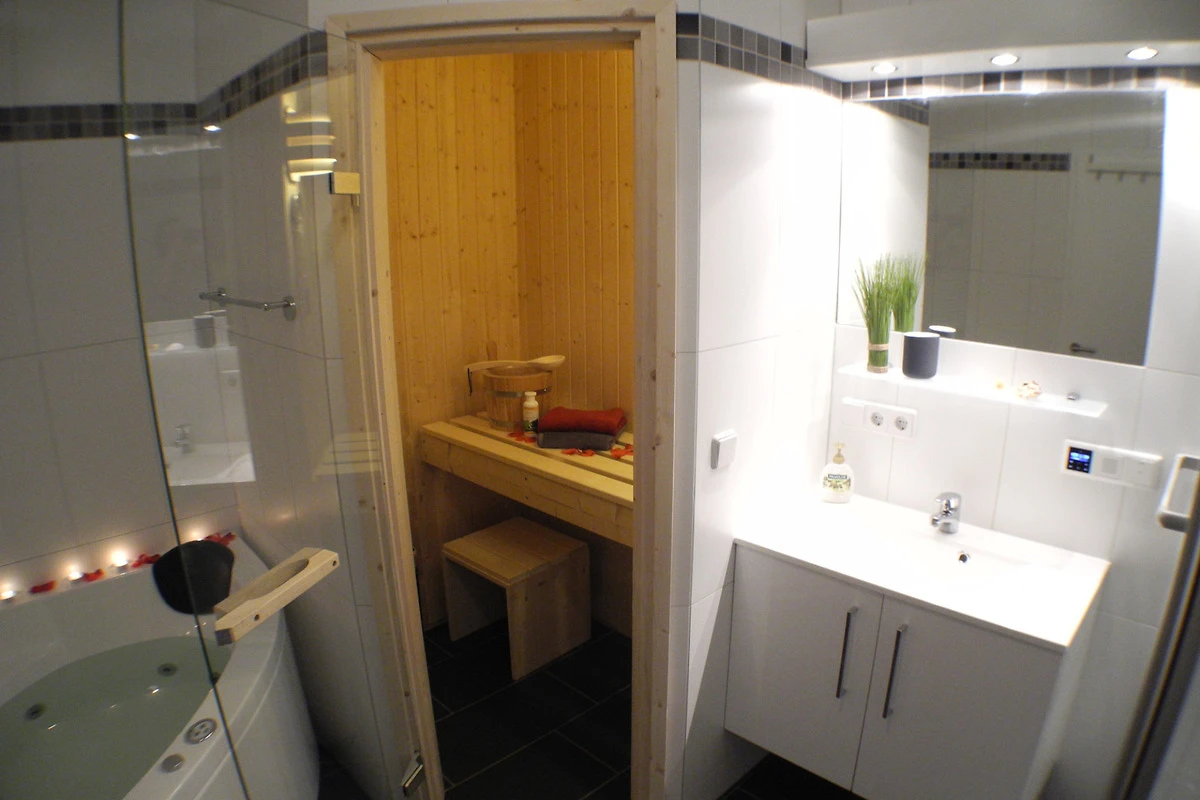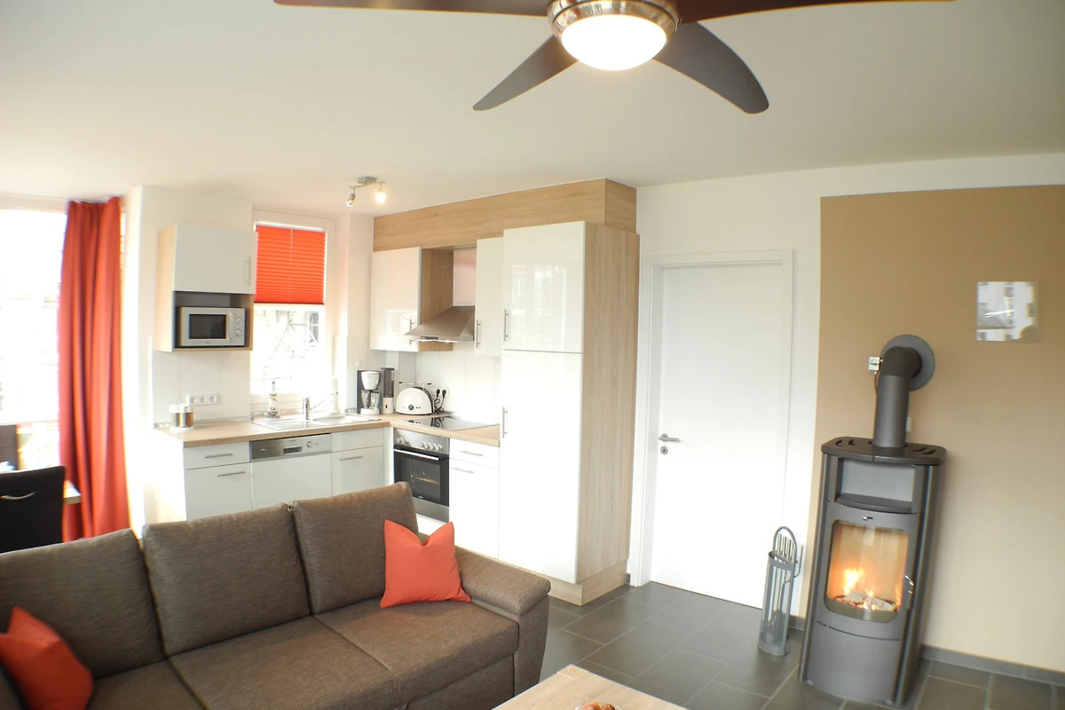 Eine hochwertige Ausstattung, u.a. mit Kaminofen, Wellnessbad mit Whirlpool und Sauna, Boxspringbetten und eine hochwertig ausgestattete Küche mit Ceranfeld, Geschirrspüler, Mikrowelle und Backofen erwarten Sie.
