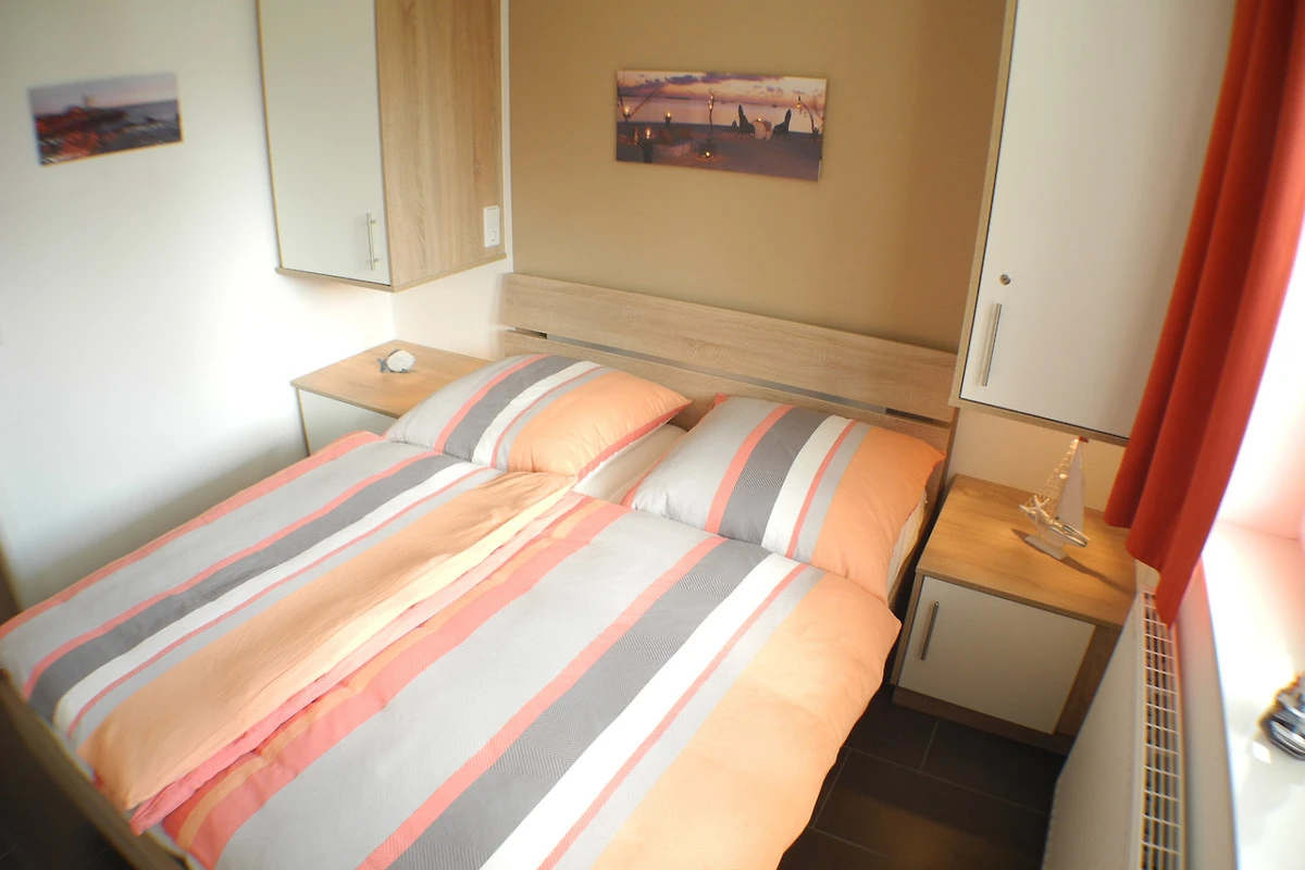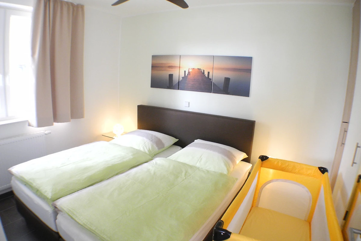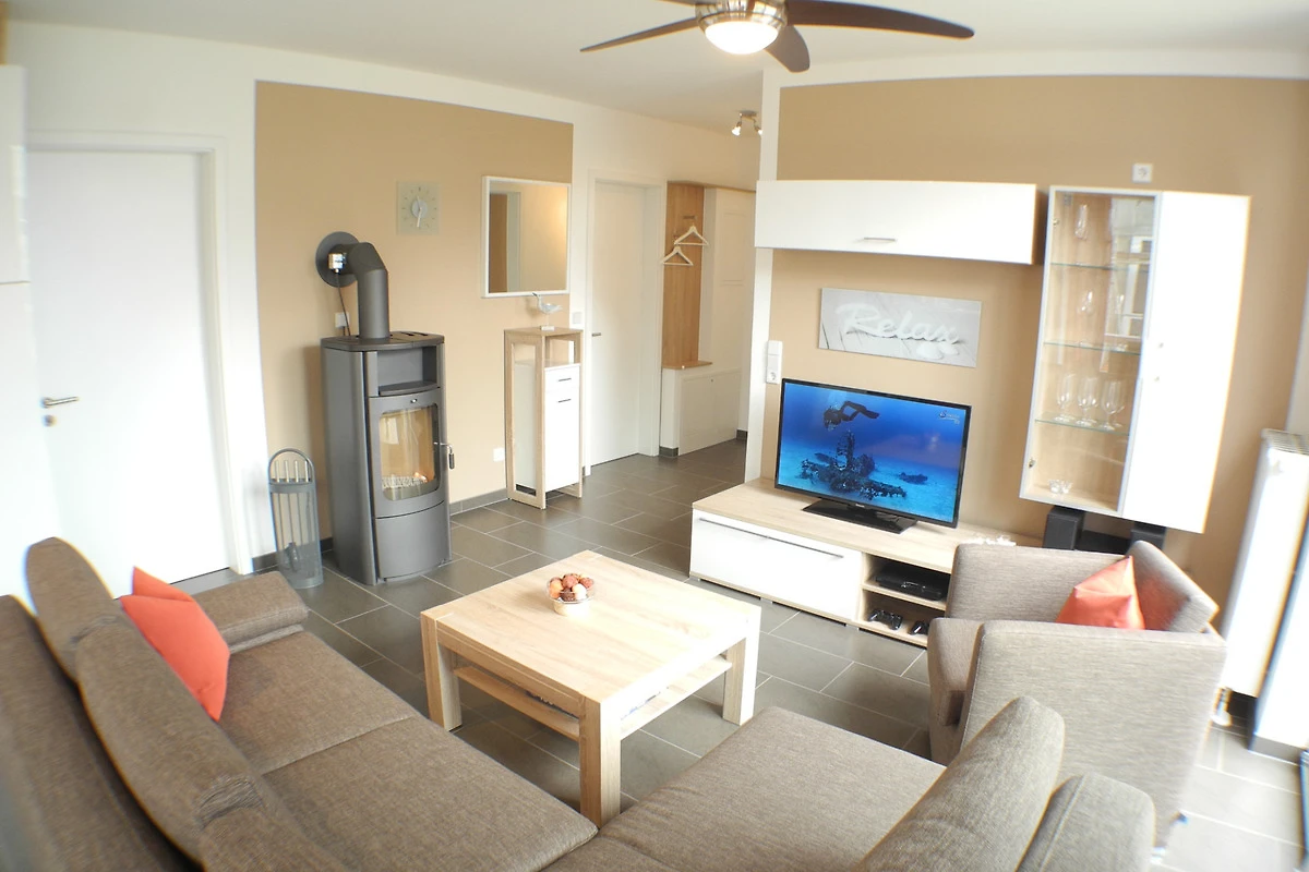Die Ferienwohnung bietet ein grosses, lichtdurchflutetes Wohn- und Esszimmer, eine offene, helle Küche, zwei Schlafzimmer mit Einbauschränken und ein Wellnessbad mit Gira Einbauradio.