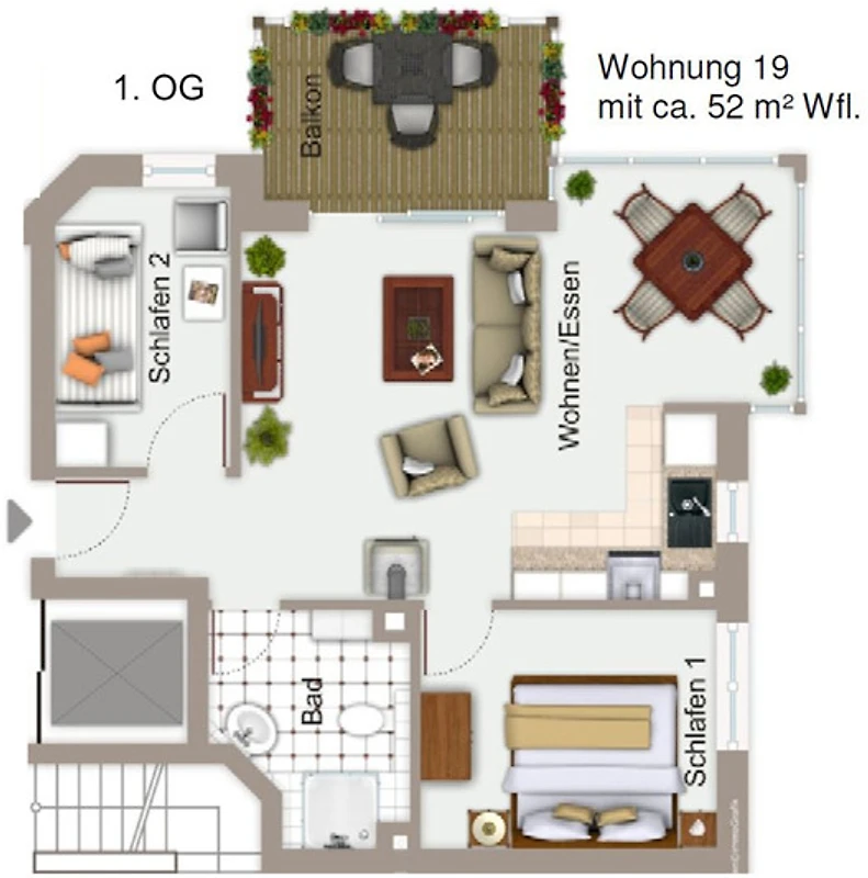 Die Wohnung befindet sich im 1. Obergeschoss. Ein Fahrstuhl ist im Haus vorhanden. Der Balkon ist nach Nordosten ausgerichtet.
