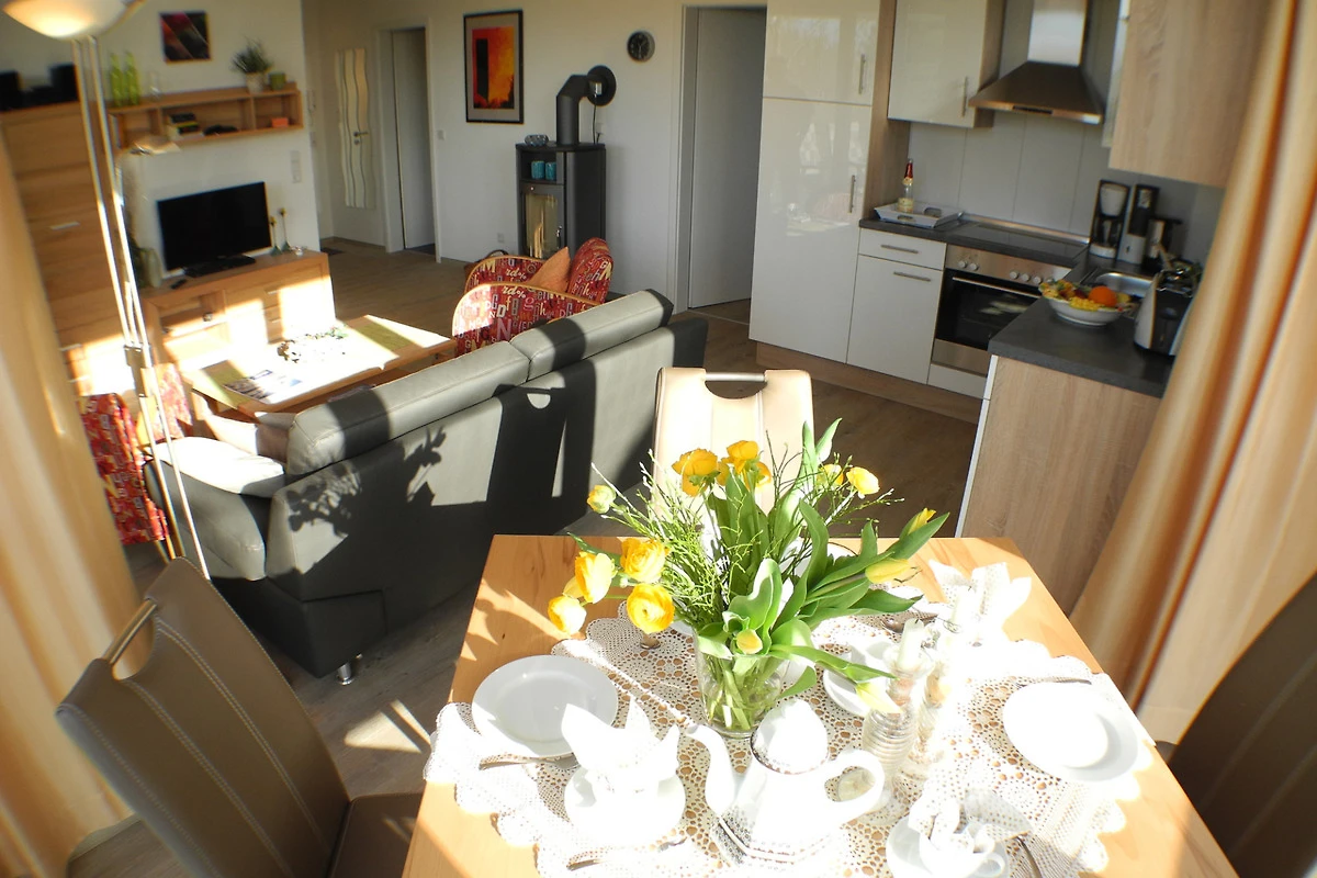 Der gemütliche Wohnbereich lädt zu erholsamen Abenden vor dem Fernseher oder dem Kamin ein. In der modernen, voll eingerichteten Küche verwöhnen Sie sich und Ihre Lieben mit kulinarischen Köstlichkeiten, die Sie im lichtdurchfluteten Essbereich oder auf dem Balkon mit Blick ins Grüne servieren können.