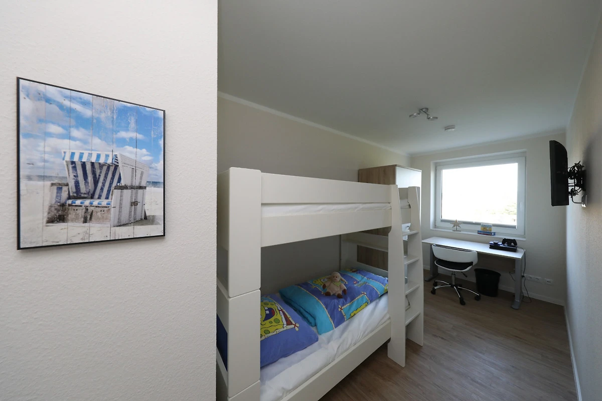 Etagenbett, Plissee am Fenster, Schreibtisch und ebenfalls einen Wand-TV