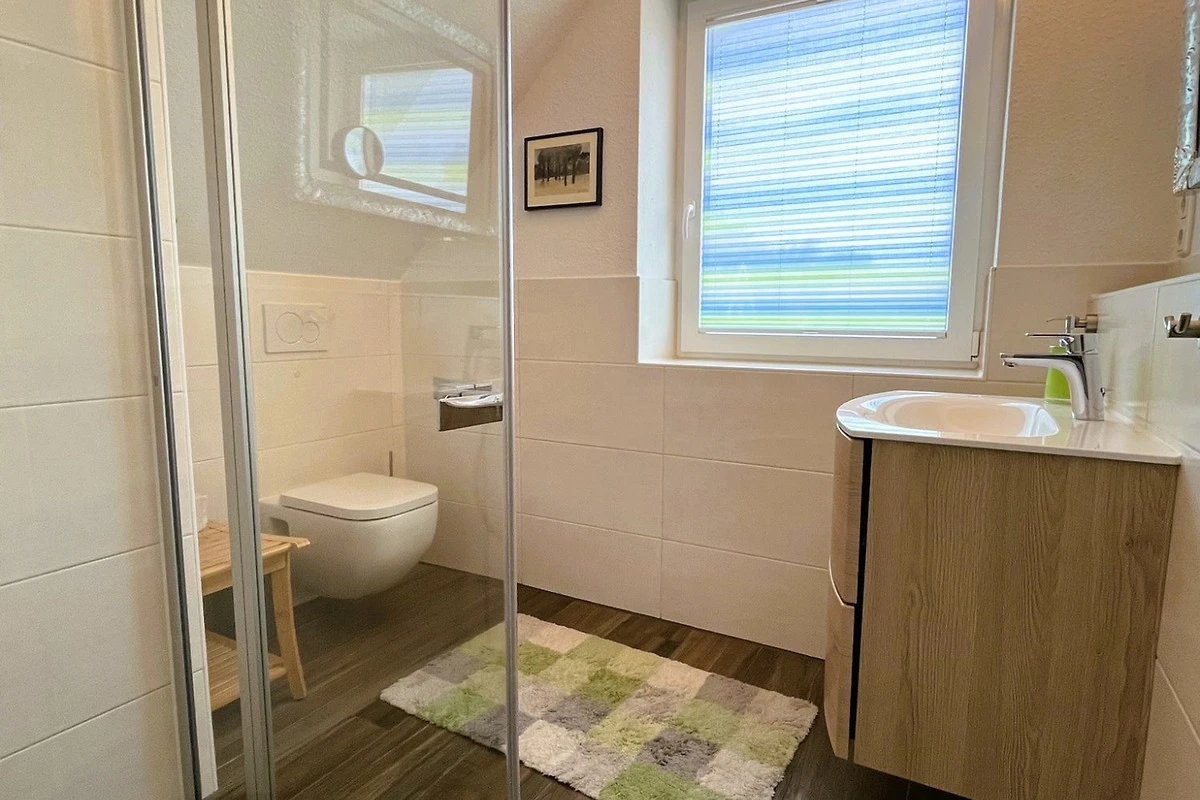 Das Schlafzimmer ist ausgestattet mit einem Doppelbett und TV, das zweite Schlafzimmer mit zwei Einzelbetten. Beide Zimmer haben einen Zugang zum Balkon. Gegenüber den Schlafzimmern liegt das Duschbad mit bodengleicher Dusche. Erd- und Obergeschoss sind durchgehend gefliest; Sie finden im gesamten Haus eine Fussbodenheizung.