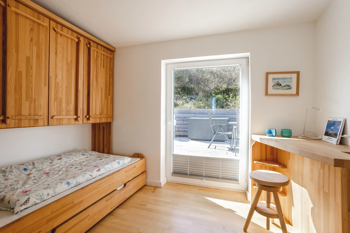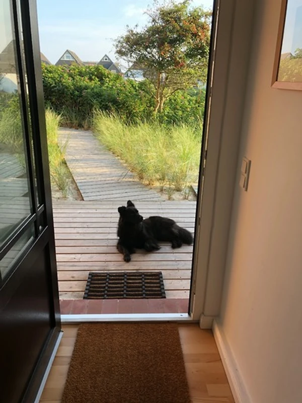 Das Haus besticht durch seine ruhige, zentrale Strandlage. Im Erdgeschoss gehen vom Flur aus ein neues, hochwertiges Duschbad mit WC und eine kleine aber vollausgestattete Küche ab. Gegenüber der Küche liegt das offene Esszimmer, hier können bis zu 6 Personen am grossen Esstisch zusammensitzen. Über die Treppe gelangen Sie ins lichtdurchflutete Obergeschoss. Dort erwartet Sie eine bequeme Sitzgruppe, die sich zu einem vollwertigen Doppelbett ausklappen lässt. In der grossen Bücherwand finden Sie persönlich ausgesuchte Literatur, oftmals mit Sylt-Bezug. Auch für Kinder haben wir von Harry Potter bis Astrid Lindgren eine reiche Auswahl an Büchern. Nicht nur für Regentage bieten wir ausserdem eine kleine Auswahl an Gesellschaftsspielen und einen 65 Zoll Flachbildfernseher. Der 11qm grosse, überdachte Balkon bietet die Möglichkeit, auch bei schlechtem Wetter draussen sitzen zu können. Wlan und Festnetztelefon sind selbstverständlich vorhanden. Vom Wohn-/Schlafraum gehen noch zwei weitere kleine Schlafräume mit jeweils einem Bett ab, bei Bedarf kann noch ein Kinderbett pro Zimmer ausgezogen werden. Von den Schlafzimmern aus haben Sie Zugang zu der windgeschützten 40qm Südterrasse, die selbst bei strammeren Westwinden zum Sonnenbaden einlädt.