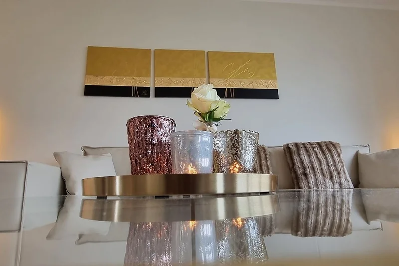 Der grosszügig und offen geschnittene Wohnbereich, lädt mit seiner freundlichen Farbgebung zum Verweilen ein und macht die Unterkunft zu einem Ort, an dem man zur Ruhe kommt.
