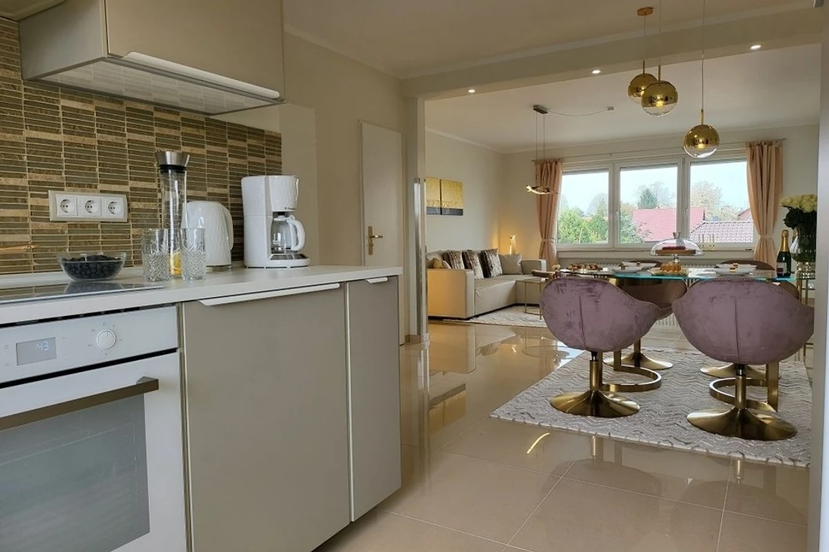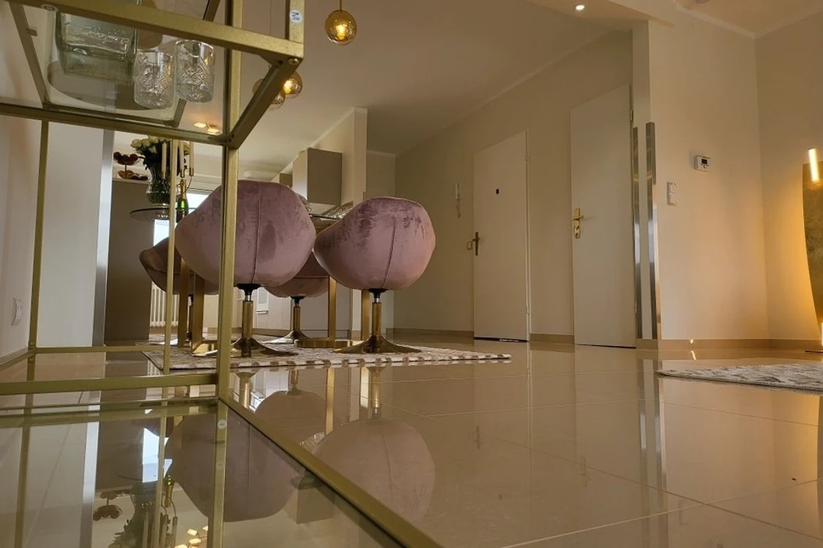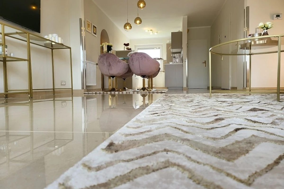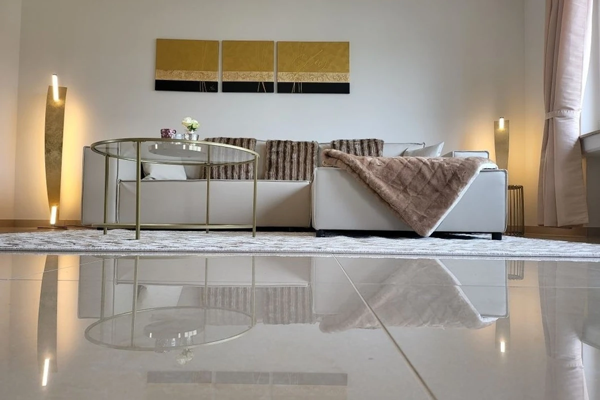 Die Hochglanzfliesen verleihen der Wohnung Leichtigkeit und Eleganz.