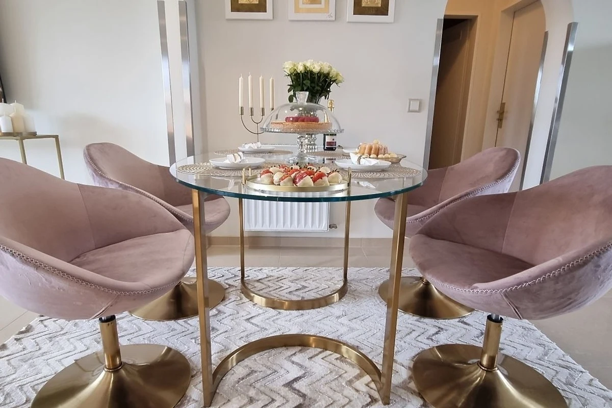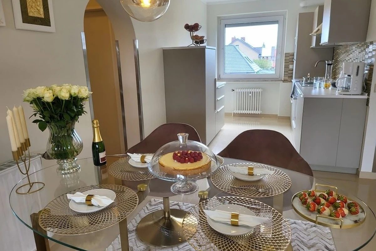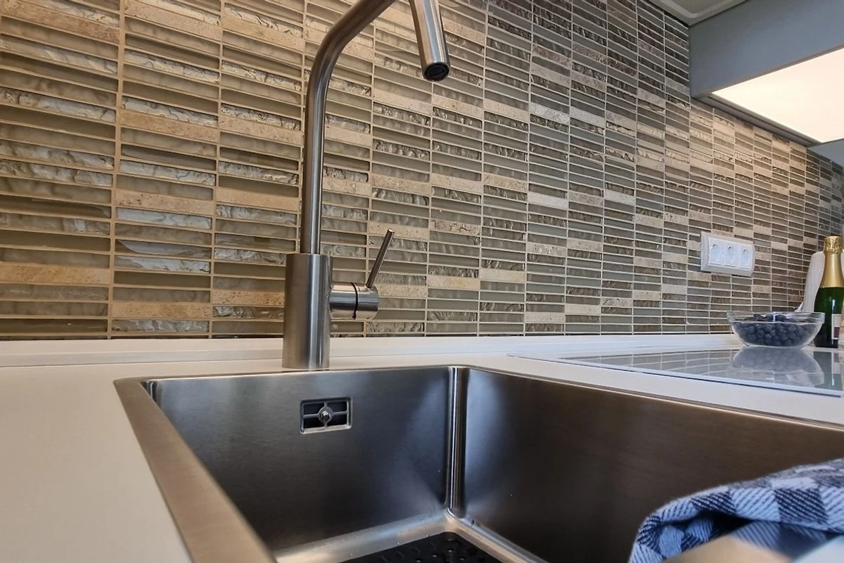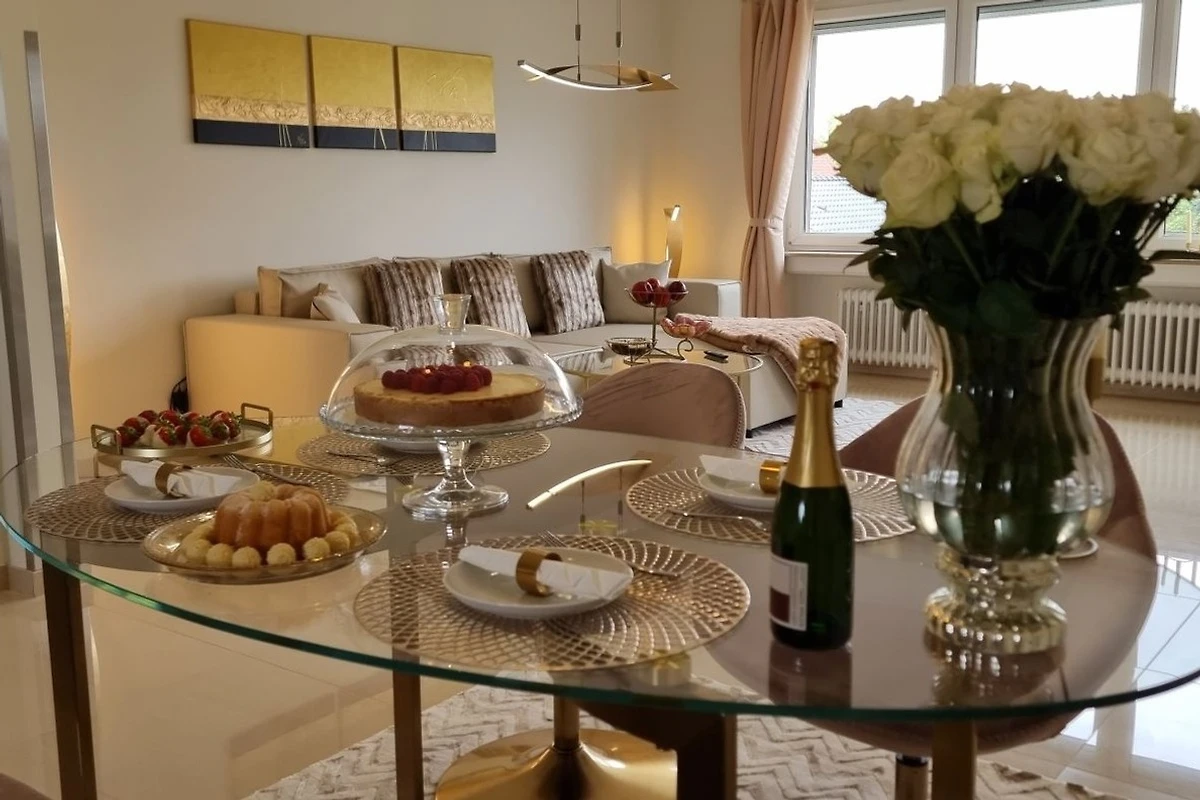 Die Hochglanzfliesen verleihen der Wohnung Leichtigkeit und Eleganz.