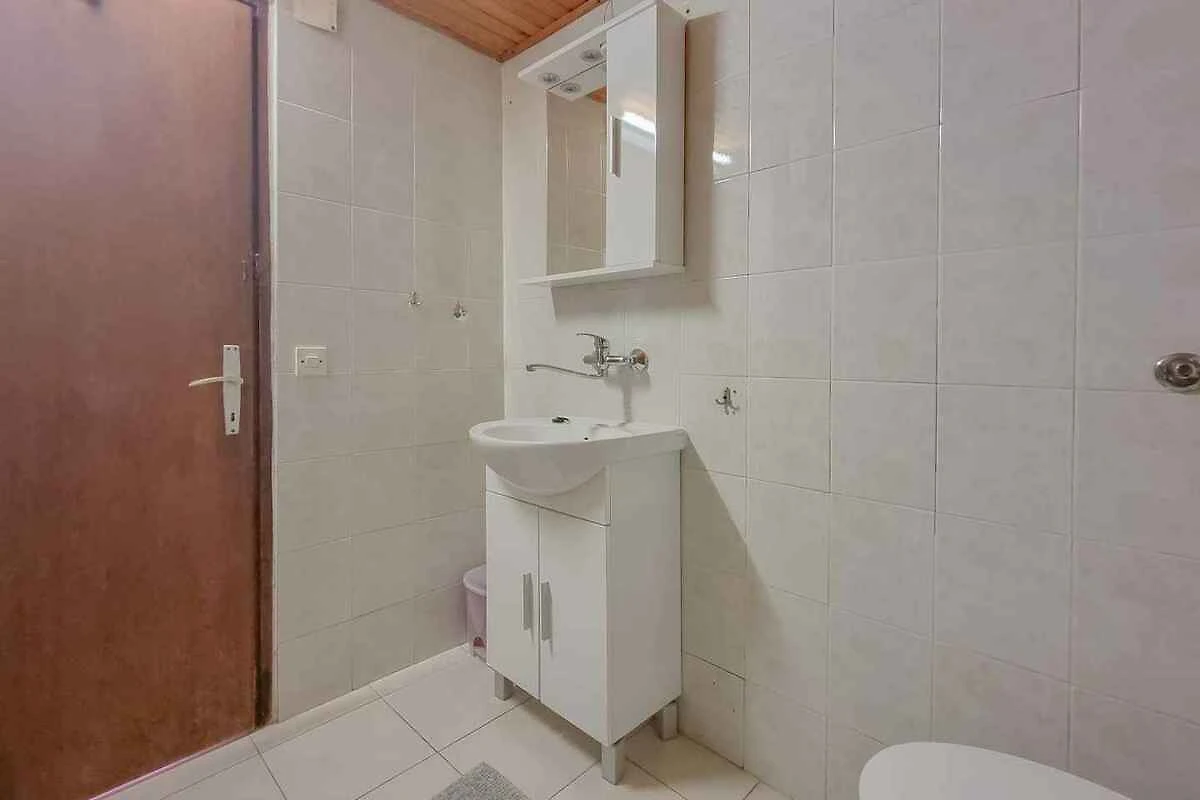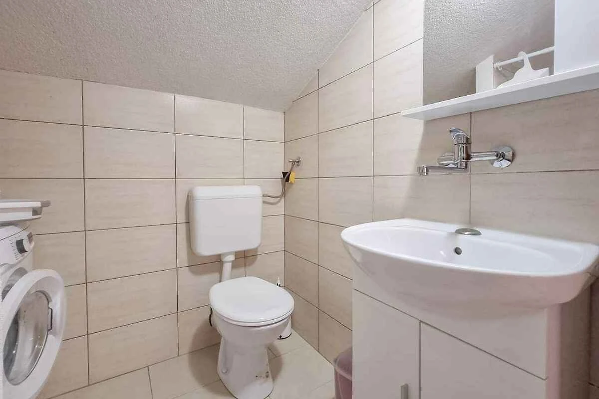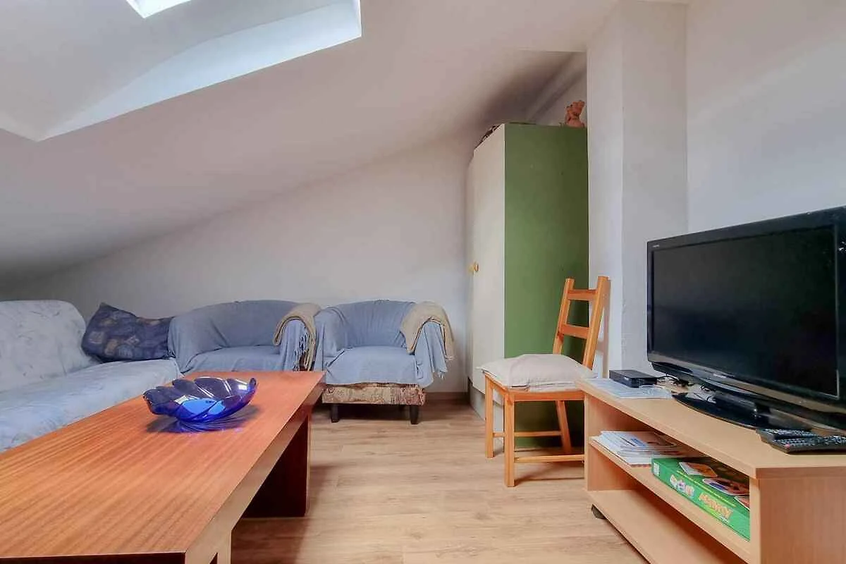 2. Etage: Wohnzimmer mit Sitzecke und TV. Bad mit Dusche, 1 Waschbecken und WC.
