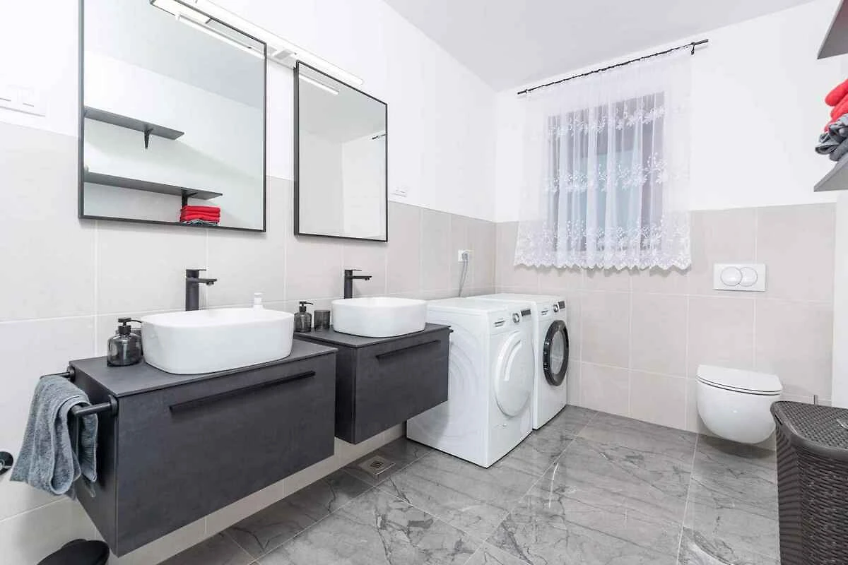 Der Eingang in Ihre Villa ist ebenerdig und führt direkt in das Wohnzimmer. Wohnzimmer (Durchgangszimmer) mit Sitzecke, TV, Essecke (8 Plätze) und Zugang zur Terrasse (überdacht, Gartenmöbel, 1 Tisch, 8 Stühle, Sonnenschirm). 2 Schlafzimmer jeweils mit 1 Doppelbett. 2 Schlafzimmer jeweils mit 2 Einzelbetten. Kochecke in der Wohnküche (Durchgangszimmer) mit TV, Essecke (8 Plätze), Elektroherd (Induktionsherd, 4 Platten), Backofen, Dunstabzugshaube, Geschirrspüler, Kühlschrank, Mikrowelle, Kaffeemaschine, Toaster, elektrischem Wasserkocher, Waschmaschine, Wäschetrockner und Zugang zur Terrasse. Bad mit Waschmaschine, Wäschetrockner, Dusche, 2 Waschbecken, WC und Fenster. Bad mit Dusche, 1 Waschbecken und WC.