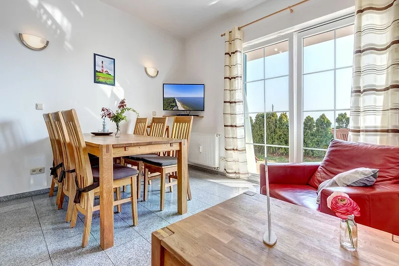 Die liebevoll eingerichtete Nichtraucher-Ferienwohnung erwartet Sie mit 2 Schlafzimmern und einem grossen Wohnzimmer mit Esstisch und einer bequemen Leder-Sitzgarnitur.