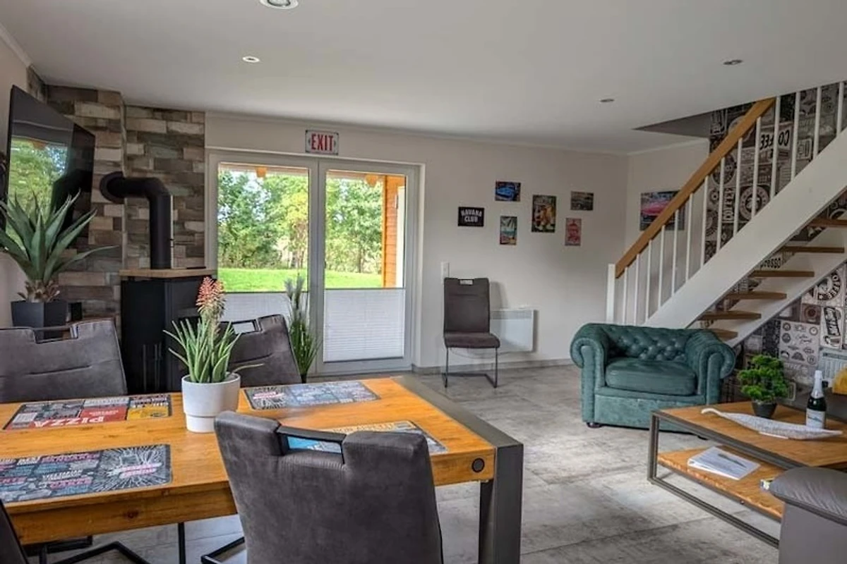 1 Wohn- / Essbereich mit Schlafcouch (für 1 - 2 Personen) mit Fussbodenheizung, Holzofen-Kamin, grossen Flachbildschirm