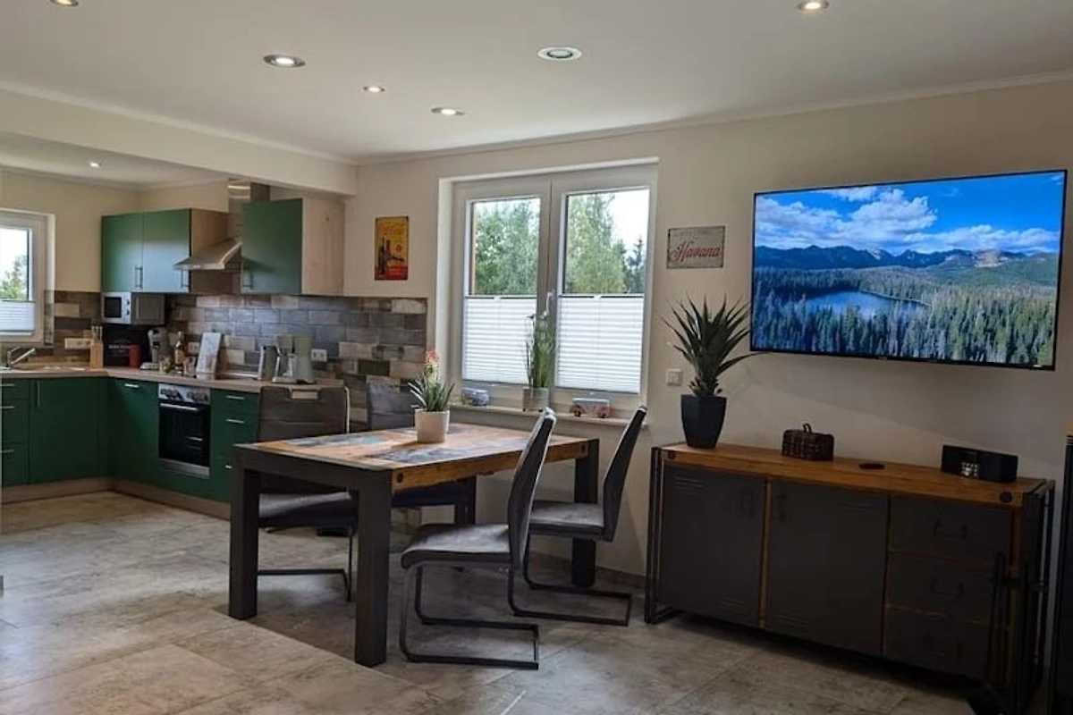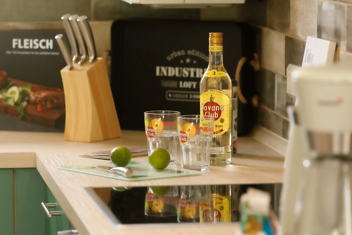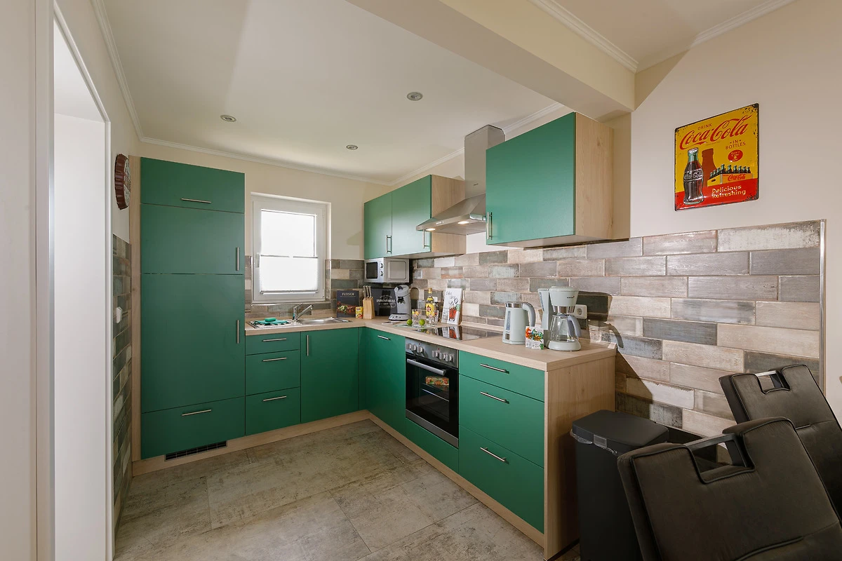 1 moderne vollausgestattete Küche mit Geschirrspüler, Mikrowelle, E-Herd (Ceran) mit Backofen, Kühl-/ Gefrierkombination, Toaster, Kaffeemaschine, Padmaschine, Mikrowelle u.v.m.