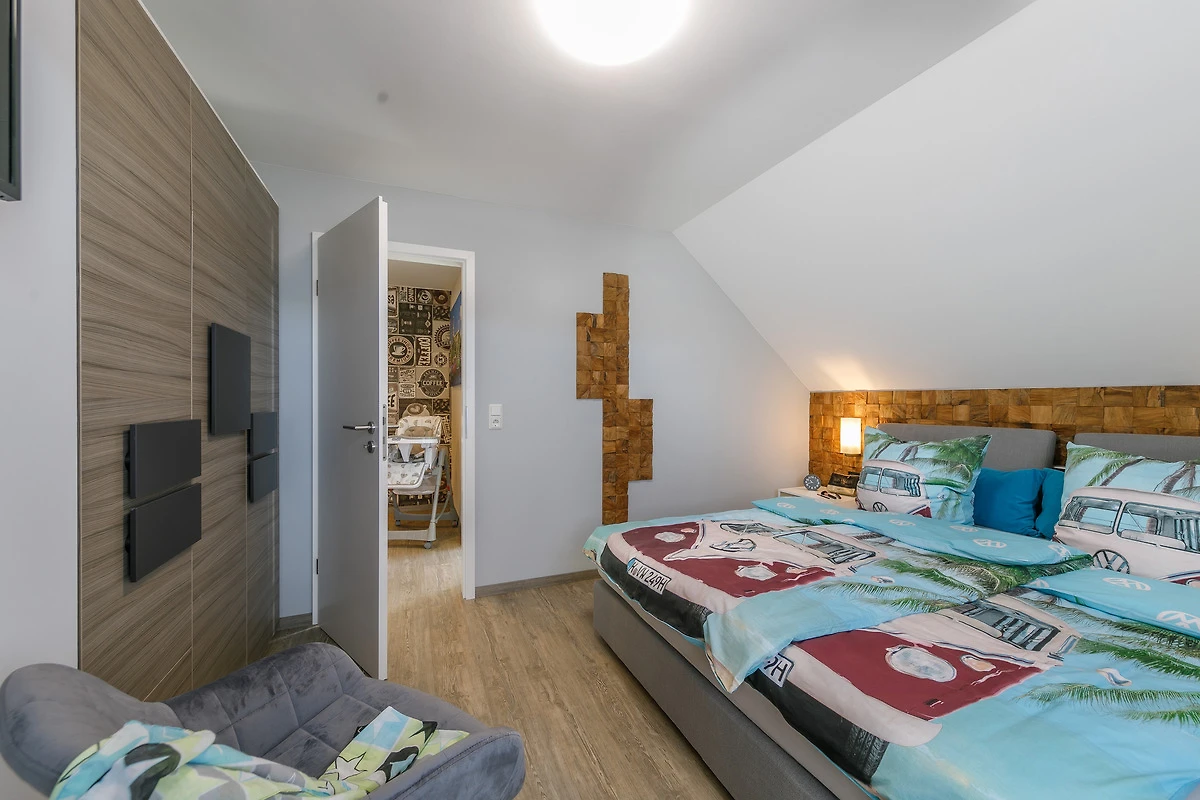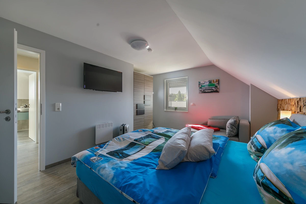 1 Schlafzimmer mit Doppelbett- Boxspringbett, 1 Liege, Kleiderschrank, SAT-TV