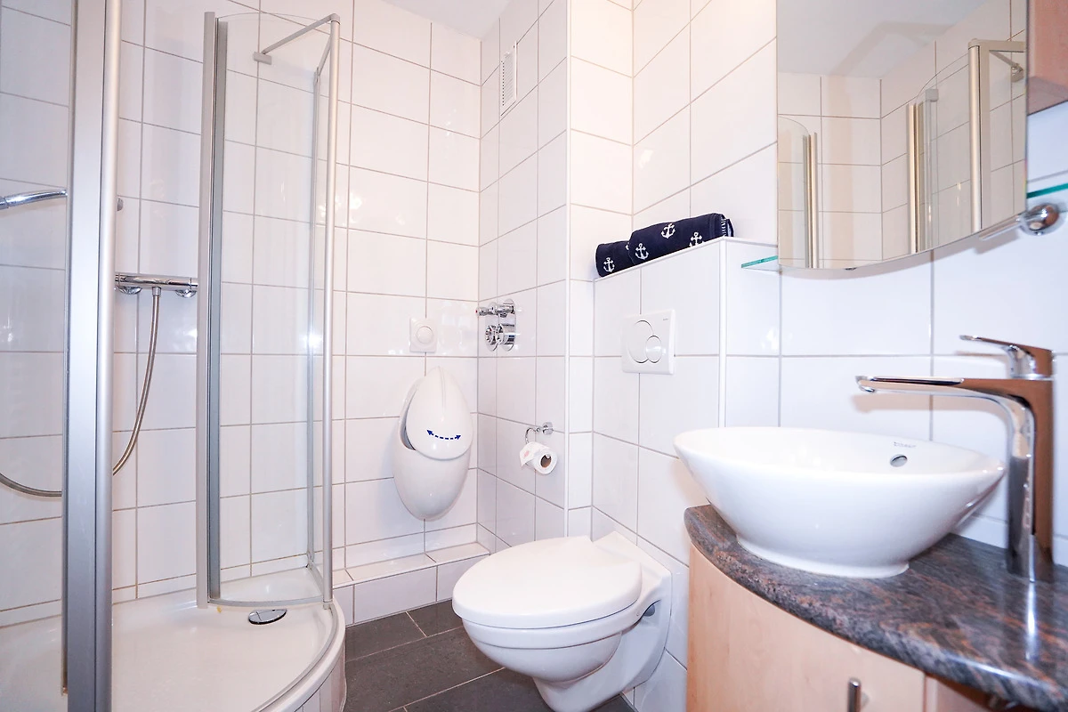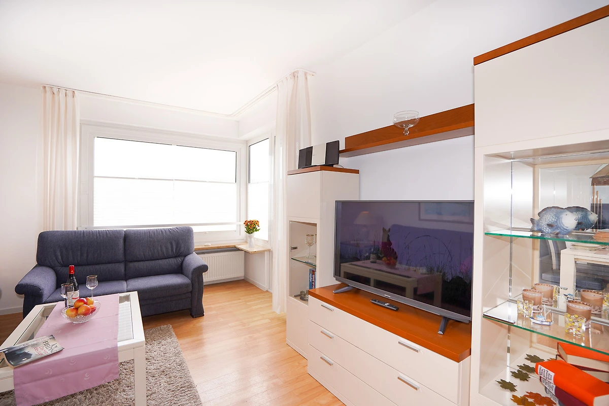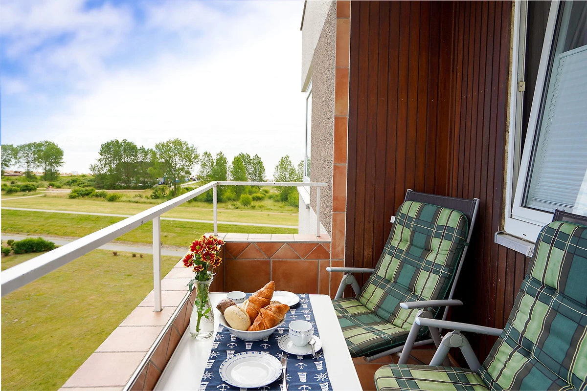 Das Wohnzimmer bietet Ihnen zwei bequeme Sofas, von denen eines als Schlafsofa verwendet werden kann. Einen Esstisch mit 4 Stühlen finden Sie hier ebenso vor, wie einen Fernseher, der zu entspannten Abenden einlädt. Erholen Sie sich nach einem aufregenden Urlaubstag auf dem Balkon mit Blick auf die Ostsee.