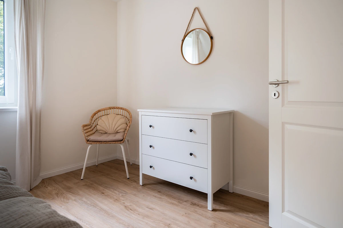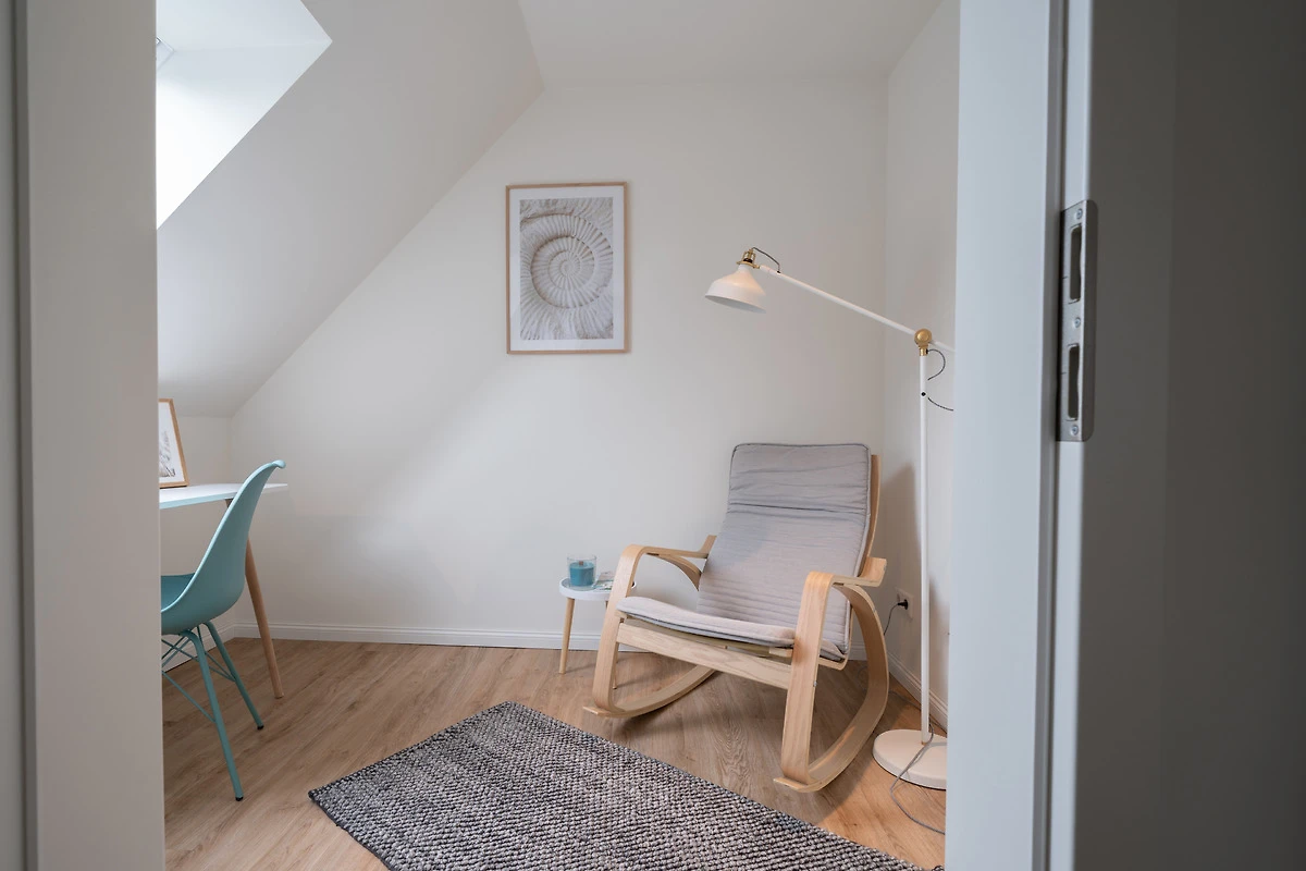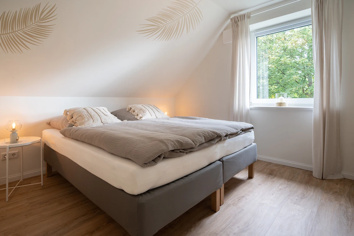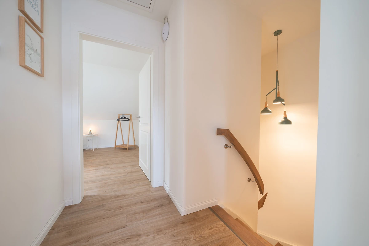 In der oberen Etage gibt es zwei Schlafzimmer - ein Zimmer mit Doppelbett (1,80 x 2,00 m) und ein Zimmer mit zwei Einzelbetten, die nach Bedarf als Doppelbett genutzt werden können. Ein kleines HomeOffice - extra Raum mit LAN-Anschluss) - steht dir ebenfalls zur Verfügung. Natürlich befindet sich auch auf der Etage ein vollausgestattetes Duschbad.