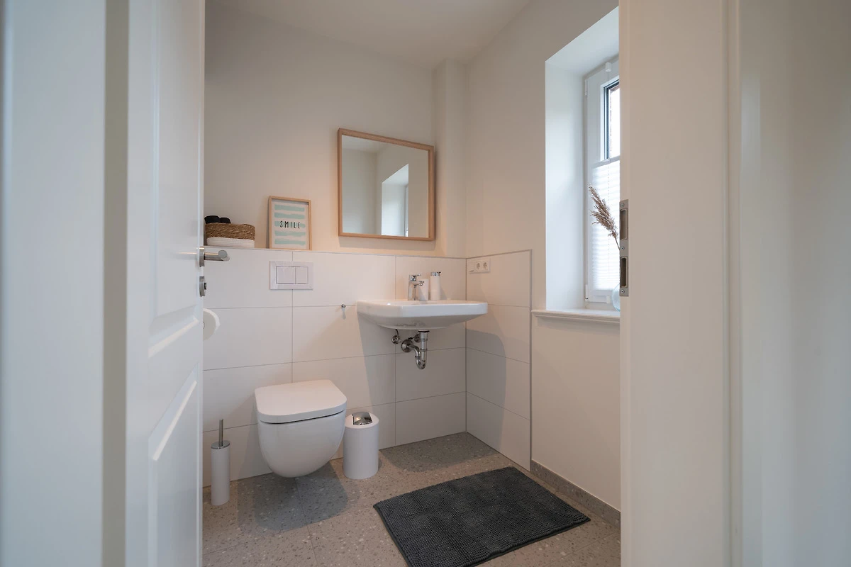 Der offene Wohn- und Küchenbereich empfängt dich hell und freundlich Im unteren Bereich. Die vollausgestattete Einbauküche lässt keine Wünsche offen. Von hier aus hast du direkten Zugang zur Terrasse und dem Garten. Ausserdem gibt es unten ein WC inklusive Dusche. Im Wohnzimmer befindet sich eine Schlafcouch, so das auch ein Aufenthalt mit sechs Personen möglich ist.